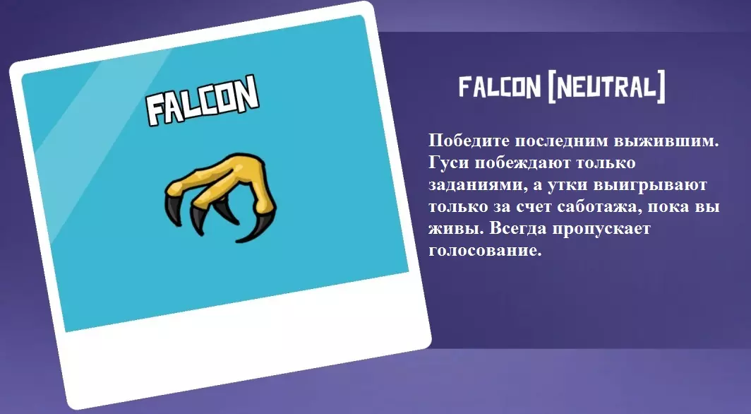 你不是叛徒,也不是和平派。你只为自己而战!你的主要目标是生存。你可以击杀地图上的任意数量玩家,无论对方是和平派还是叛徒。只要你活着,鸭子阵营就无法通过数量超过鹅阵营来获胜,鹅阵营也无法通过击杀或投票淘汰所有鸭子来获胜。当地图上只剩下3名玩家(包括你猎鹰在内)时,将开始倒计时,倒计时结束时如果你仍然存活,即可获胜。投票时你不能对任何玩家投反对票,只能投跳过票。 GOOSECHAPEL和SS MOTHERGOOSE地图的角色