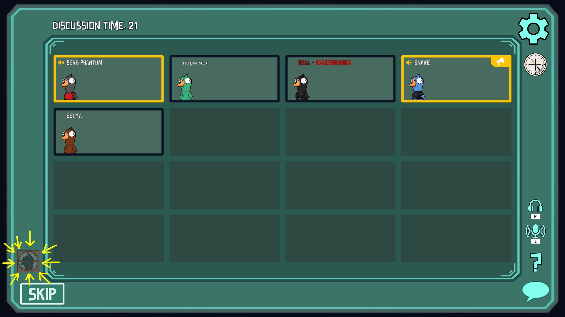 你是叛徒。在整个游戏中,你可以吃掉地图上的一具尸体,从而剥夺平民玩家关于该尸体的信息以及报告它的机会。如何使用这项技能由你自己决定。 沉默鸭
