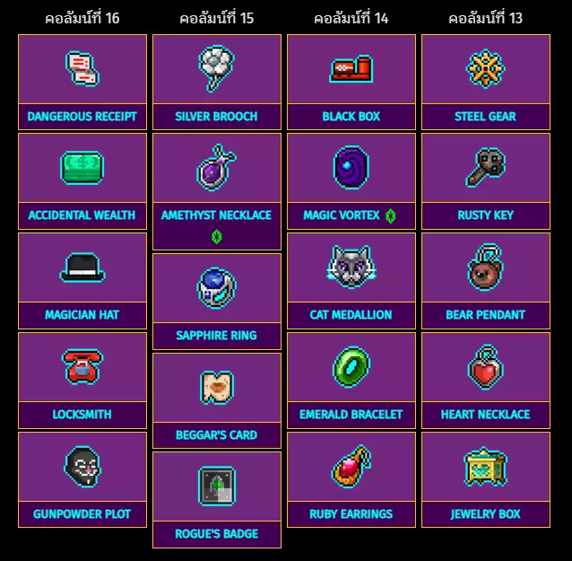第16列 第15列 第14列 第13列 危险收据 银胸针 黑匣子 钢制齿轮 意外财富 紫水晶项链 魔法漩涡 生锈的钥匙 魔术师帽子 蓝宝石戒指 猫形徽章 熊吊坠 锁匠 乞丐的卡牌 祖母绿手镯 心形项链 火药阴谋 盗贼的徽章 红宝石耳环 首饰盒 特殊物品:第17列至20列 从右到左排列列