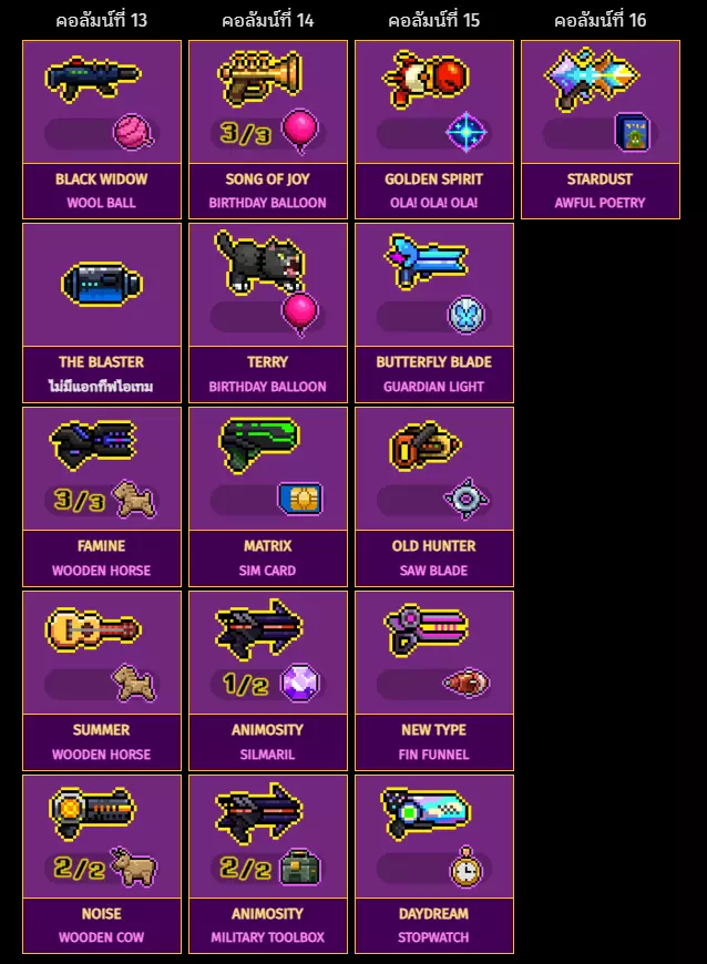 栏目1 栏目2 栏目3 栏目4 审判[1/2] 后备补给 星云刮刮卡 灵魂使者光钻石 扳机鱼[1/2] 钓鱼竿 气枪羽毛书签 彩虹[1/2] 刮刮卡 雷霆[1/2] --- 塑料枪[1/3] 木制骰子 流星[1/2] --- 命运金筹码 死亡射线[1/2] 法槌 塑料枪[2/3] 金色骰子 金色涟漪炼金术卷轴 乘客糟糕诗集 摇篮曲[1/2] --- 塑料枪[3/3] 麻将 吉米炼金术卷轴 光之舞者[1/3] 光钻石 第八色[1/2] 巧克力盒 摇篮曲[2/2] 虚拟宠物 武器:栏目5至8上行是武器名称,下行是道具名称武器