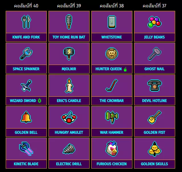 40栏 39栏 38栏 37栏 刀叉 玩具全垒打棒 磨刀石 软糖豆 太空扳手 雷神之锤 猎人女王 幽灵指甲 巫师之剑 埃里克的蜡烛 撬棍 恶魔热线 金钟 饥饿护身符 战锤 黄金之拳 动能刃 电钻 愤怒小鸡 黄金头骨 特殊物品:41栏至44栏 从右到左排列栏目