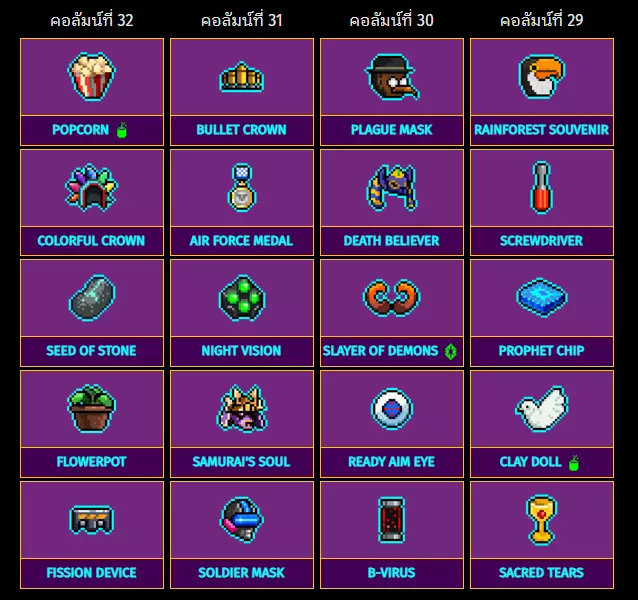 32列 31列 30列 29列 爆米花 子弹皇冠 瘟疫面具 雨林纪念品 彩色皇冠 空军勋章 死亡信徒 螺丝刀 石之种 夜视仪 恶魔杀手 先知芯片 花盆 武士之魂 瞄准之眼 黏土娃娃 裂变装置 士兵面具 B病毒 神圣之泪 特殊物品:33列至36列 从右到左排列列