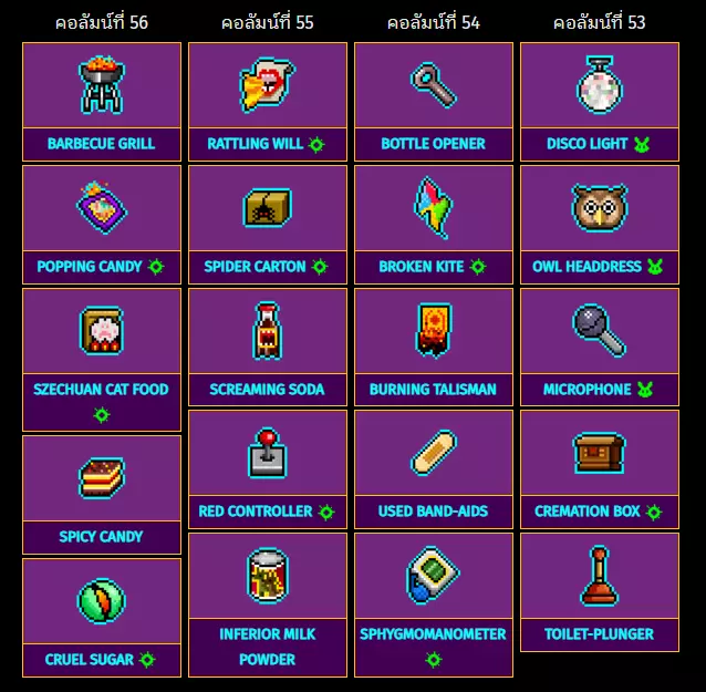 56列 55列 54列 53列 烧烤架 摇晃的意志 开瓶器 迪斯科灯 跳跳糖 蜘蛛纸盒 破风筝 猫头鹰头饰 四川猫粮 尖叫苏打 燃烧的护身符 麦克风 辣味糖果 红色手柄 用过的创可贴 骨灰盒 残酷的糖 劣质奶粉 血压计 马桶搋子 特殊物品:57列至58列 从右到左排列列