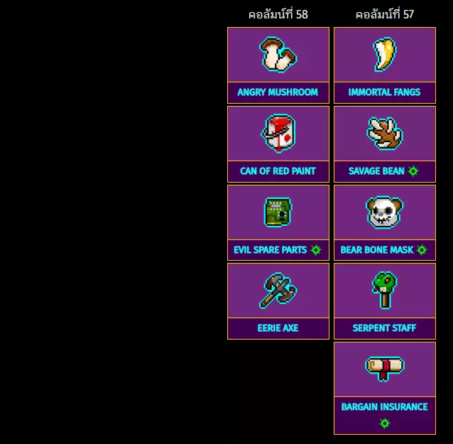 斯巴达血脉 诱饵鲨鱼 硬币炸弹 不朽之心 狂战士之血 空罐头 佣兵领主 火焰之心 霍华德反应堆 怜悯兜帽 黄金雕像 薛定谔的测试版 特工手表 国王皇冠 战斗通行证 内心之眼 7号钢笔 魔法豆 黄金鸟 沙漠灵药 特殊物品:第13列至第16列 从右到左排列列