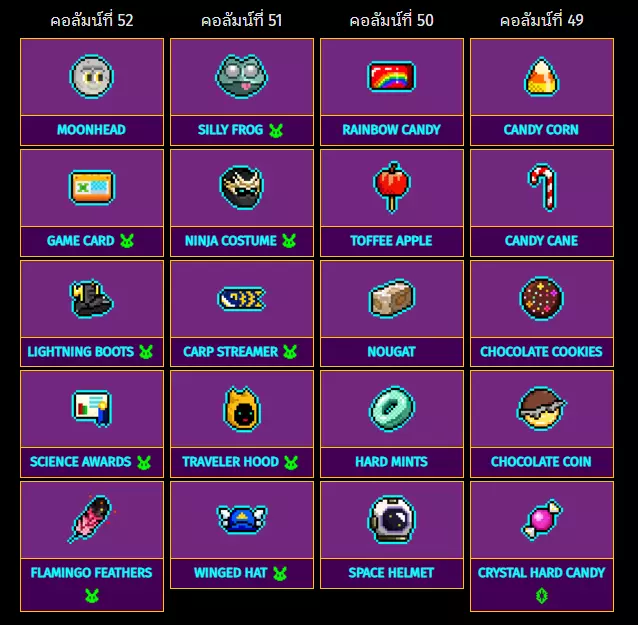 52列 51列 50列 49列 月球头 傻青蛙 彩虹糖果 玉米糖 游戏卡牌 忍者服装 太妃苹果 糖果手杖 闪电靴 鲤鱼彩带 牛轧糖 巧克力曲奇 科学奖 旅行者兜帽 硬薄荷糖 巧克力硬币 火烈鸟羽毛 翼帽 太空头盔 水晶硬糖 特殊物品:53列至56列 从右到左排列列