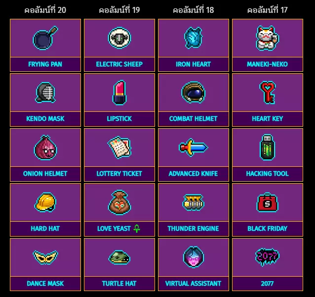 平底锅 电子羊 钢铁之心 招福猫 健道面具 口红 战斗头盔 心之钥 洋葱头盔 彩票 高级匕首 黑客工具 安全帽 爱心酵母 雷霆引擎 黑色星期五 舞蹈面具 海龟帽 虚拟助手 2077 特殊物品:第21列至24列 从右到左排列列