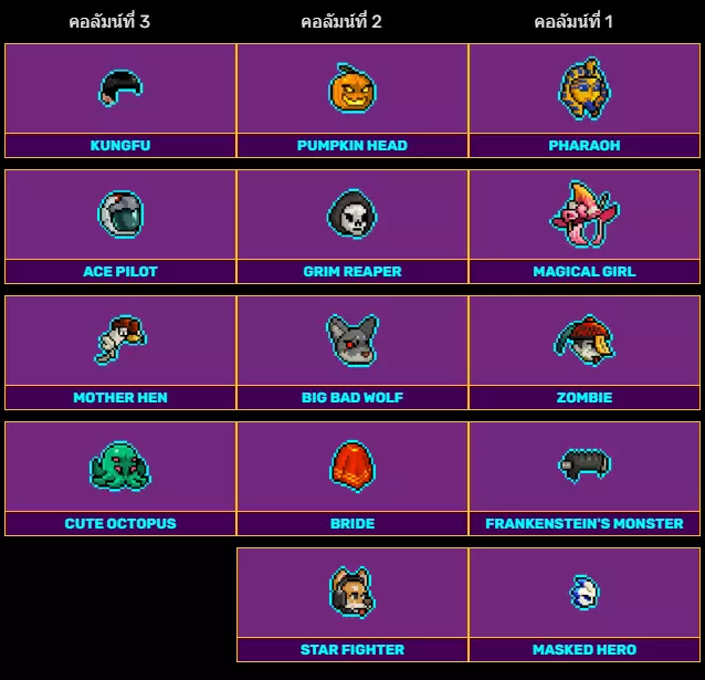 第三列 第二列 第一列 功夫 南瓜头 法老 王牌飞行员 死神 魔法少女 母鸡妈妈 大坏狼 僵尸 可爱章鱼 新娘 科学怪人 星际战士 假面英雄 万圣节套装:获取途径 万圣节套装可通过开启万圣节宝箱(黄黑色礼物箱)获得,该宝箱是从普通事件中掉落的,例如从敌人身上掉落、完成普通战斗房间后掉落。在游戏中破坏各种南瓜会掉落物品。平均每次游玩只能获得一套万圣节套装,还有可能重复获得已有的套装! 特殊物品:第1列到第4列 从右到左排列列