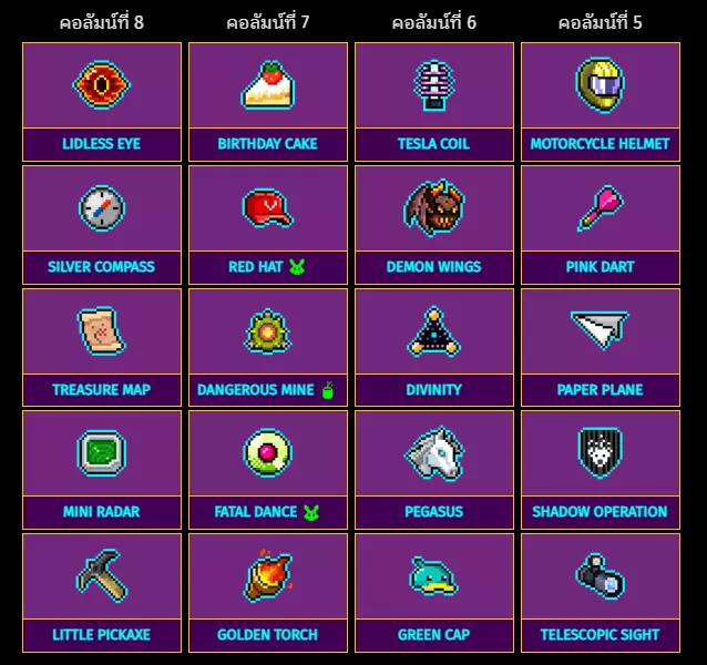 无眼之瞳 生日蛋糕 特斯拉线圈 摩托车头盔 银色罗盘 红帽子 恶魔之翼 粉色飞镖 藏宝图 危险矿井 神性 纸飞机 迷你雷达 致命之舞 飞马 暗影行动 小镐 金色火炬 绿色帽子 望远镜瞄准镜 特殊物品:第9列至第12列 从右到左排列列