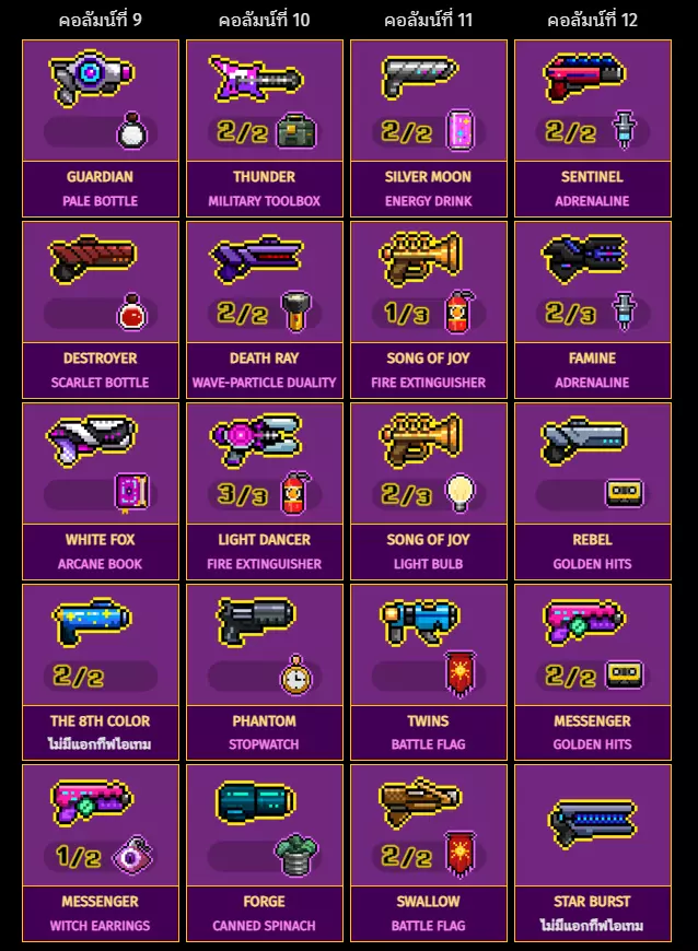 第9列 第10列 第11列 第12列 守护者 苍白瓶 雷霆[2/2] 军用工具箱 银月[2/2] 能量饮料 哨兵[2/2] 肾上腺素 破坏者 猩红瓶 死亡射线[2/2] 波粒二象性 欢乐之歌[1/3] 灭火器 饥荒[2/3] 肾上腺素 白狐 奥秘之书 光之舞者[3/3] 灭火器 欢乐之歌[2/3] 灯泡 叛逆者 黄金打击 第八色[2/2] --- 幻影 秒表 双子 战旗 信使[2/2] 黄金打击 信使[1/2] 女巫耳环 熔炉 菠菜罐头 飞燕[2/2] 战旗 星爆 --- 武器:第13列至16列 上面的行是武器名称 下面的行是特效物品名称武器