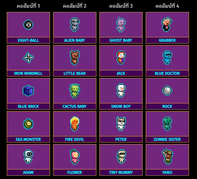 列1 列2 列3 列4 八球 外星宝宝 幽灵宝宝 抓取者 钢铁风车 小熊 杰克 蓝医生 蓝砖块 仙人掌宝宝 雪人 岩石 海怪 火焰恶魔 彼得 僵尸姐妹 亚当 花朵 小木乃伊 矢野 宠物:列5至列7