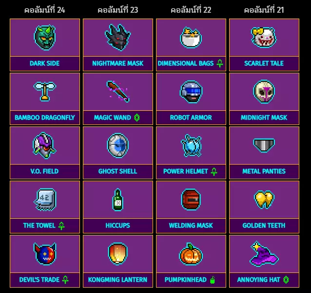 黑暗面 噩梦面具 次元背包 猩红传说 竹蜻蜓 魔法棒 机器人装甲 午夜面具 V.O.领域 幽灵外壳 能量头盔 金属内裤 那条毛巾 打嗝 焊接面罩 金牙 恶魔交易 孔明灯 南瓜头 烦人的帽子 特殊物品:第25列至第28列 列从右到左排序