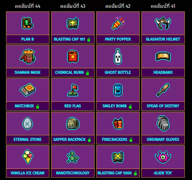 栏目44 栏目43 栏目42 栏目41 计划B 爆破雷管101 派对彩炮 角斗士头盔 萨满面具 化学灼烧 幽灵瓶 头带 火柴盒 红旗 笑脸炸弹 命运之矛 永恒之石 工兵背包 鞭炮 普通手套 香草冰淇淋 纳米科技 爆破雷管5000 外星玩具 特殊物品:栏目45至48 栏目从右到左排列
