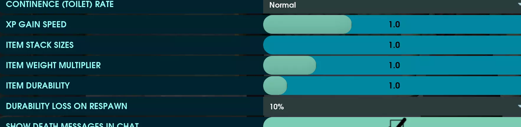 在沙盒设置的玩家选项卡中,有一些非常重要的设置需要调整。 经验值获取速度: 单人游玩时设为2,双人游玩时设为1.3,与配合不佳的大型团队游玩时设为1.2,与配合良好的大型团队游玩时保持默认。简单来说,人数越少,就需要更少的时间来刷取必要技能,所以调高经验值获取速度。 物品堆叠数量: 把这个数值调高。个人建议设为10,但如果你不想建造大量储物箱,也可以调到最高。这能让物品的收集和储存变得更加轻松,减少在基地和资源采集点之间不必要的往返次数。角色重量限制仍然会防止你携带过多物品。 物品耐久度: 将此项设置为3。这是我调整最多的数值,理想数值就是3。默认设置下,武器损坏速度极快,以至于你需要携带多把武器来应对,这非常糟糕,而且还会让资源获取变得更困难,因为武器会占用更多背包格子。设置为3时,你可以愉快地离开基地冒险,但如果你只带一把武器,在探险中过于贪心仍有耗尽耐久度的风险。这是一个很好的平衡,在我看来比默认设置更好。 冷藏效果: 将此项调至【非常有效】。这让食物管理变得轻松一些,减少了有人在“食物任务”上忙碌,而其他人却在外面进行精彩冒险的情况。 饥饿/口渴速率 这是我和更大团队游玩后的一点调整建议。我建议,对于3人及以上的团队,降低角色感到饥饿/口渴的速度。可能将其设置为原始速度的75%-50%。除非你团队里有人真的喜欢一直待在家里做零食,而其他人出去冒险。否则这几乎会迫使某人一直担任厨师的职责。 调整 - 推荐 最后,有一些我真心推荐的调整,但每个人在游戏中的偏好可能有所不同。