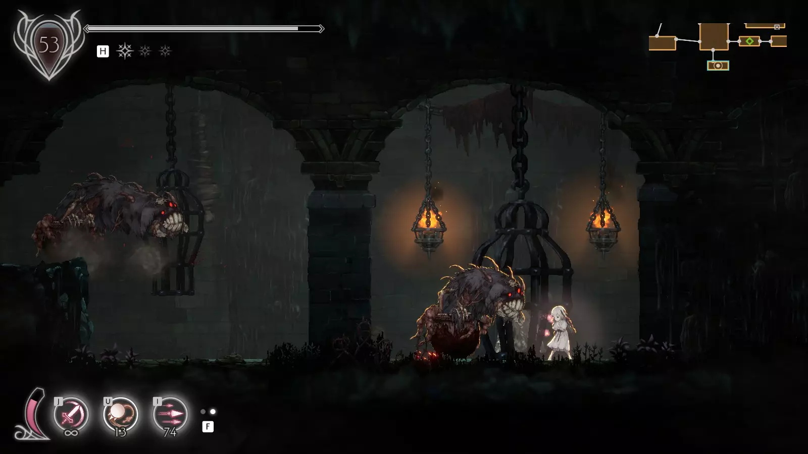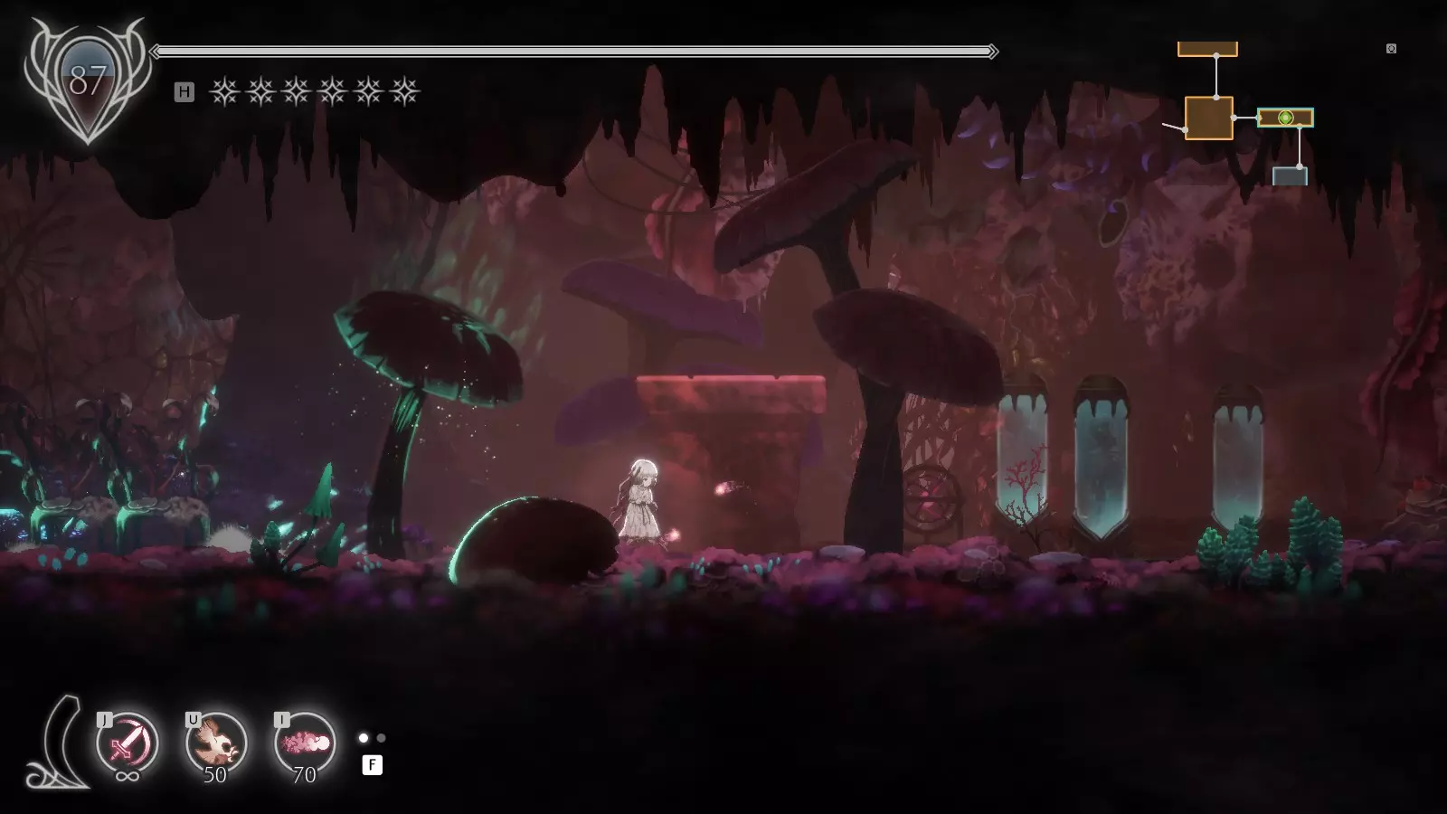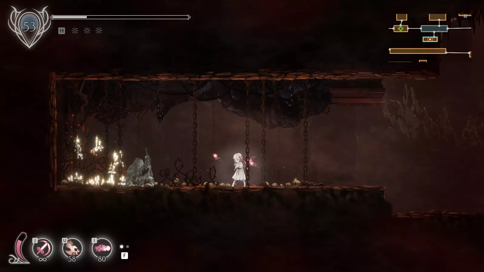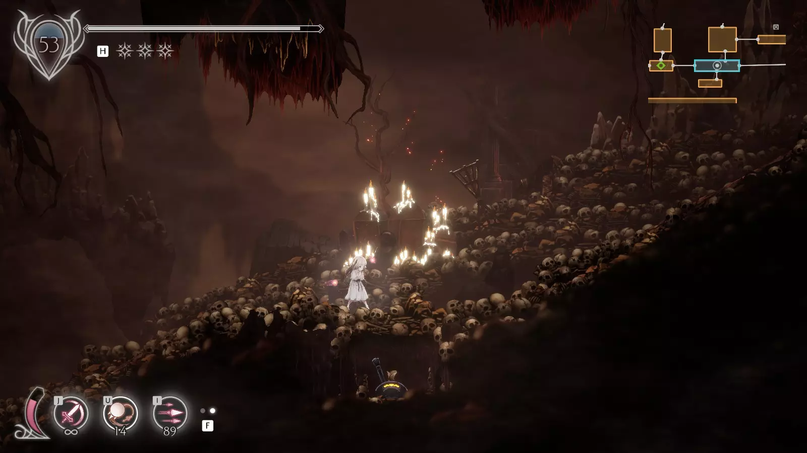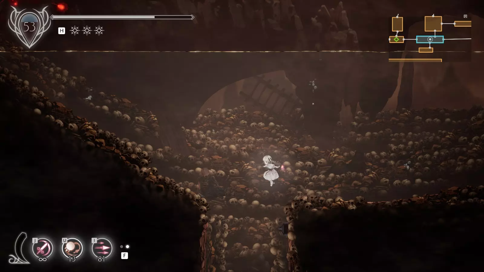 地点2 2个残魂 休息点【尸山】出门向右。 下落时攻击可以在此处打散迷雾,然后跳下去开启开关。