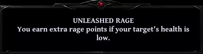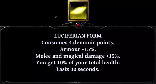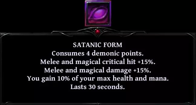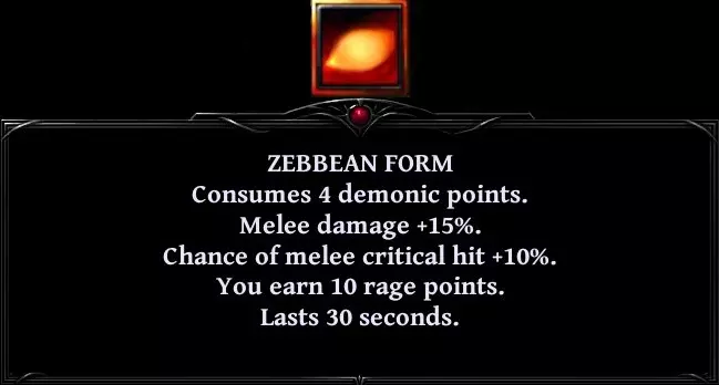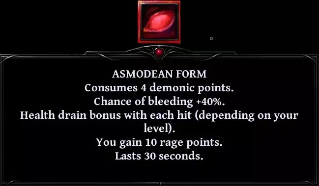 • 你的下一次近战攻击将根据你的每点怒气值提升1%伤害。 • 你恢复20%的最大生命值。若你的生命值低于30%,则改为恢复40%。 • 你闪避下一次攻击。 • 在你的下一次攻击期间,你获得所造成伤害的50%作为生命值。 • 使你当前的怒气值翻倍(最高20点)。 • 你的下一次攻击将是瞬发的。 • 根据你的等级从每个敌人身上吸取生命值(每级2点)。然后你按比例恢复生命值、法力值和怒气值。 • 将下一次攻击的伤害翻倍,以流血和中毒效果形式体现。 • 使敌人陷入3秒疲劳状态。若你的生命值低于30%,则改为施加5秒疲劳。 • 你的下一次攻击必定暴击且不会落空。 • 你变身为恶魔形态。 角色拥有五种姿态。6级解锁
