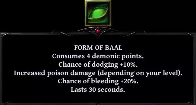 角色每级获得: • 8点生命和4点法力 • 每2级获得1%闪避 • 每3级获得1点毒素伤害 • 每4级获得2%流血几率 在第五场战斗中,你将获得恶魔形态