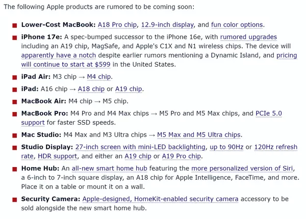 目前,有多款苹果产品被传即将发布,包括: 低价位MacBook:搭载A18 Pro芯片、12.9英寸显示屏; iPhone 17e:可能配备A19芯片、MagSafe以及苹果的C1X和N1无线芯片; iPad Air:芯片从M3升级到M4; iPad:芯片从A16升级到A18或A19; MacBook Air:芯片从M4升级到M5; MacBook Pro:芯片从M4 Pro和M4 Max升级到M5 Pro和M5 Max,并支持PCIe 5.0以实现更快的SSD速度; Mac Studio:芯片从M4 Max和M3 Ultra升级到M5 Max和M5 Ultra; Studio Display:配备27英寸屏幕、mini-LED背光、最高90Hz或120Hz刷新率、HDR支持以及A19或A19 Pro芯片; Home Hub:全新智能家庭中心,配备更个性化的Siri、6至7英寸方形显示屏、A18芯片,支持FaceTime等; 还有苹果设计的支持HomeKit的安全摄像头配件。 来源:快科技-手机频道 点击此处查看原文>>>