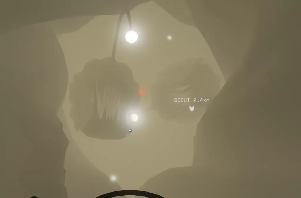 没错,你最可怕的噩梦已经联手复活了,它们长着锋利的牙齿,而且数量众多! 那么我们该怎么办呢? 如果你——我强调一下是“如果”——去过无光之城、琵琶鱼瞭望区和踏石区,你就会学到一些关于琵琶鱼的有用知识。 它们完全是【盲的】,并且【依靠声音】来追踪猎物。 记住这个信息,应该会更容易(其实并没有)弄清楚该怎么做。 从红点入口稍微后退一点。现在,将你的穿梭机直接对准它,用点力向前推进! 如果你已经明白了,你应该会漂过那些鱼,朝着你的侦察兵信号前进。如果你还没完成上一步,难度已经相当大了,而且你能看到种子入口,赶紧把油门踩到底。这些“垂钓者”比看起来要快。 一旦进入,你就安全了;它们不会跟你进入下一关。 在你前方的,应该就是【容器】。