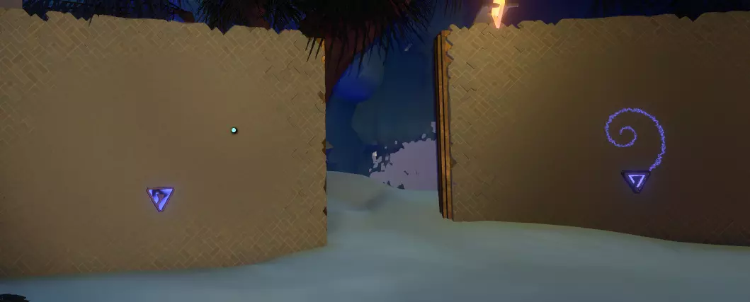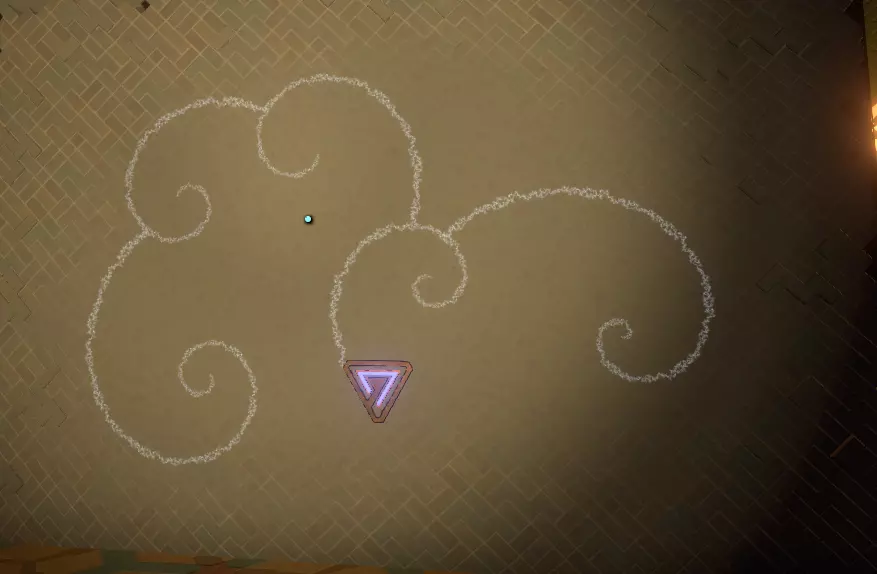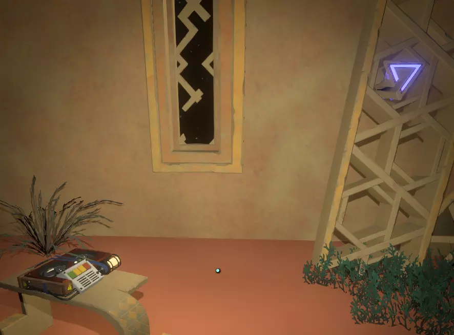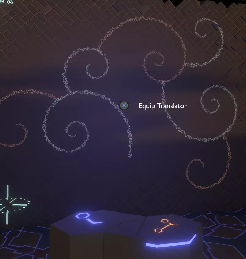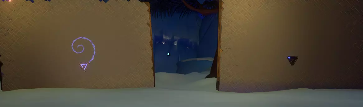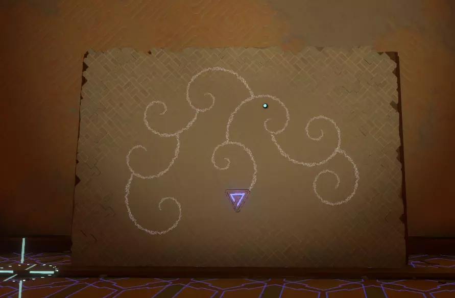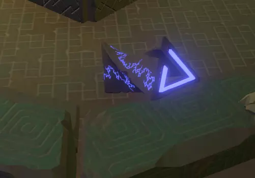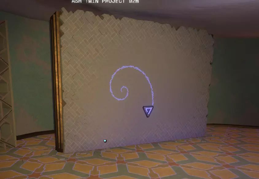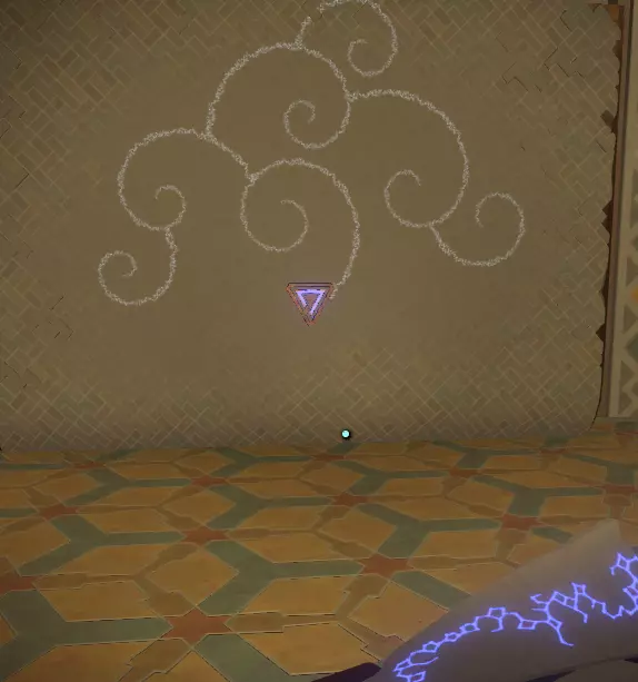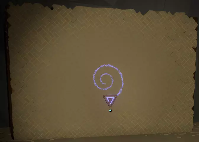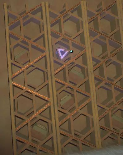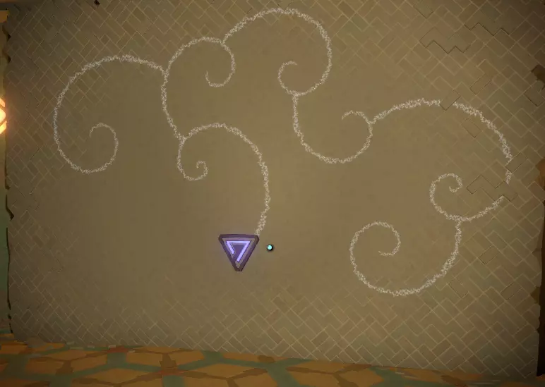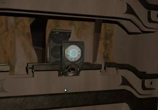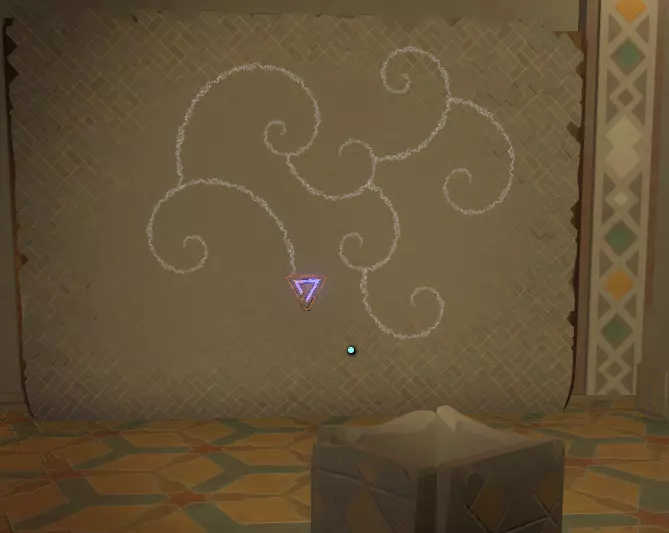 阅读译文以了解【眼睛信号定位器】的信息;显然,该装置位于地面之上。 再往右边是另一堵空白的墙和一个空的三角形孔洞。旁边是一个储物架,上面有一个可以拿起的三角形物件,那是一份诺玛伊卷轴,将其插入墙上的三角形插槽中,会出现更多未翻译的文字。