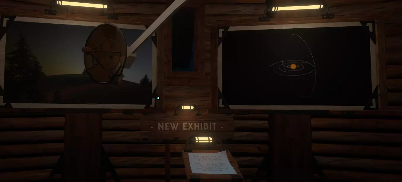 它是否指引你前往其他地方? 如果你足够敏锐,就去新的地点。 如果你没察觉到,那我会告诉你该做什么以及去哪里。毕竟,如果不能在所有步骤中提供帮助,一份“完整探索指南”还有什么用呢? 首先前往博物馆/天文台。仔细检查展品(一楼),那里确实有一个【新展品】! 但它其实并不是真的新,我的意思是,那里确实写着“新展品”,但它并不是新的。 如果你在游戏刚开始时探索过博物馆,就会知道在你的家乡陨石坑外有一座无线电塔,我们去过那里,我也提到过。你还会知道,这座无线电塔是为了接收来自一颗发射到太空的深空卫星的信号而建造的,该卫星用于实时拍摄太阳系的照片。如果你去过无线电塔(我们在本指南的最初几节中就进去过),你会知道那里有一段录音,我们已经听过这段录音了(你确实听了,对吧?)。 我们也知道那里有一些卫星在太空中拍摄到的事物的照片。 这些都不是什么“新内容”。 但无论如何还是前往无线电塔吧,只是为了满足一点好奇心。如果你想更容易找到它(其实真的没那么难),你可以进入飞船电脑的地图模式,找到木炉星,浏览条目并高亮“无线电塔”。 到达那里后,或许,或许可以再听一遍录音。用新的视角再看看那些照片。 它们展示了哪些我们以前没注意到的东西呢? 没什么吗?是啊,确实没什么,对吧? 但也许这才是你应该关注的照片