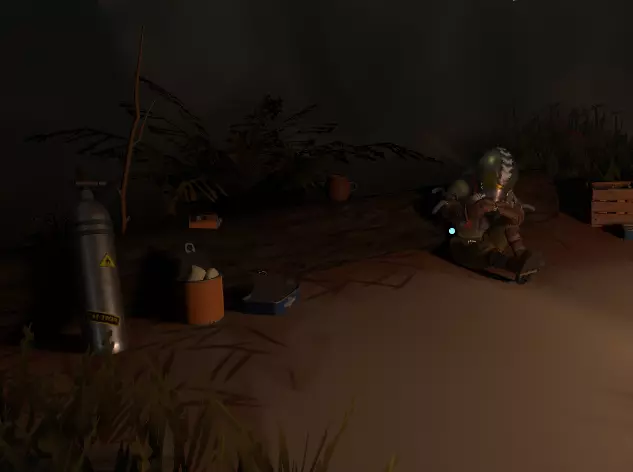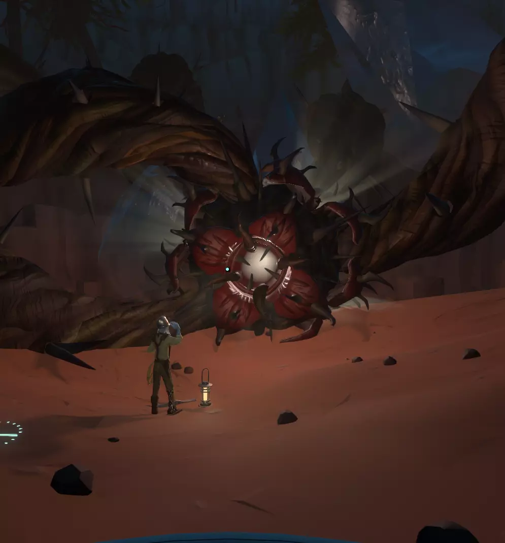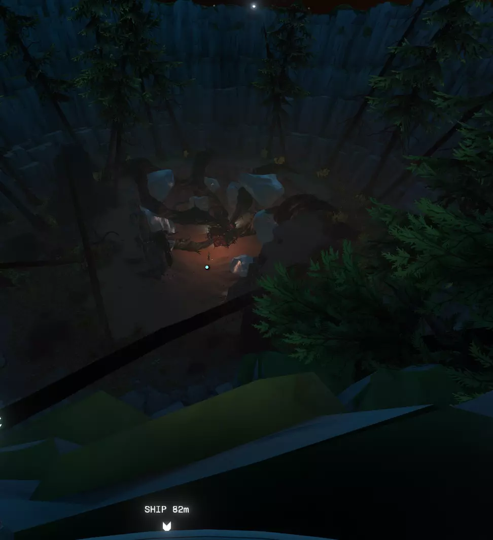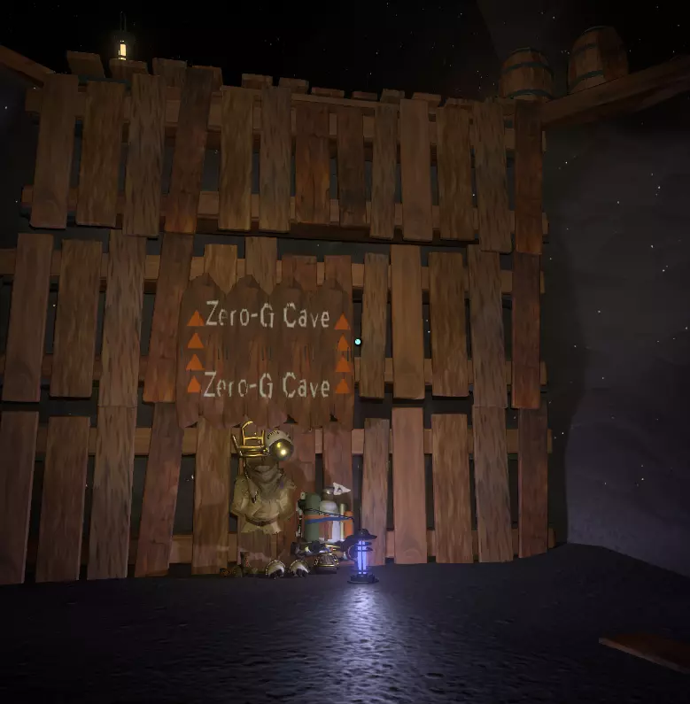 如果我遗漏了本体游戏中的任何脚本、文本或其他内容,请在评论区留言,我会找到并添加。 感谢阅读! DLC - 可下载内容 - 寻找方向 欢迎你,勇敢的旅行者、无畏的探险家! 如果你正在阅读这段文字,我希望你已经通关了《星际拓荒》本体游戏中令人震撼的结局,并且已经购买了扩展内容,或者准备开始探索扩展内容【回声之眼】。 那么我们该如何开始呢? 这可是个关键问题。或者更应该问:“从哪里开始?” 我们已经知道,《星际拓荒》是一款关于一个小小太阳系的宏大游戏。它充满了无数的秘密、谜团、谜题、难题和烧脑的挑战,有时甚至会让人感到抓狂。DLC“眼之回响”的起点很容易被忽略。 你可能像之前十几次那样,在同一个营火旁醒来。 从这个视角看,一切似乎都没变?你甚至可能会想:“该死,我还以为已经摆脱这个重复的时间循环了!” 但请记住本指南开头我提到的关于《星际拓荒》的一点:这是一款极度依赖探索与发现的游戏!它确实会给你线索,你只需要先找到它们! 所以最明显的问题应该是:“有什么变化?” 或者甚至是:“有什么新东西吗?” 环顾你的小家园陨石坑,有任何不同或新的事物吗? 第一个提示:它不在零重力洞穴里。这地方明显得有点滑稽,我要是告诉你,你肯定会拍着脑袋说“该死,我真是个笨蛋!”我当时就是这样! 你探索过博物馆里的展品吗? 哦——!这是什么?