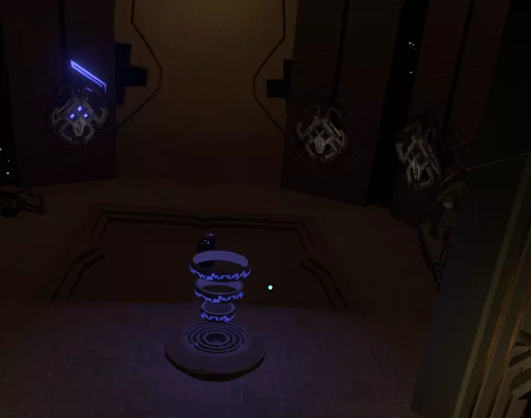 现在下楼到底部。这里有一些指向其他地点的诺玛语文字标识,但我们稍后再去看它们。 你面前有一道淡蓝色的光束,旁边有一个控制器。看着那个球体,将它移动到向下的位置。