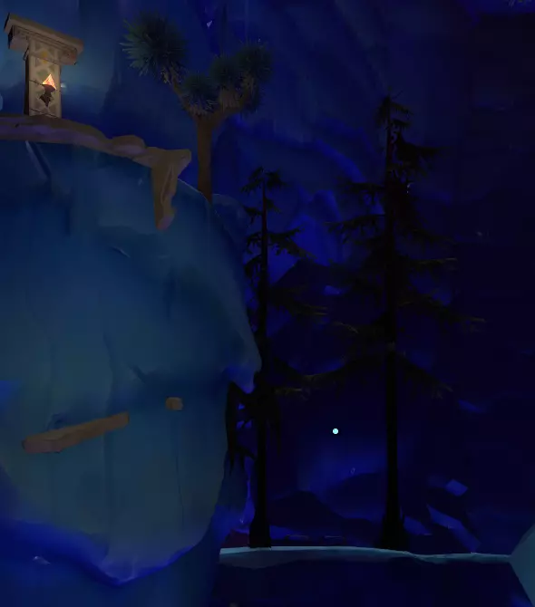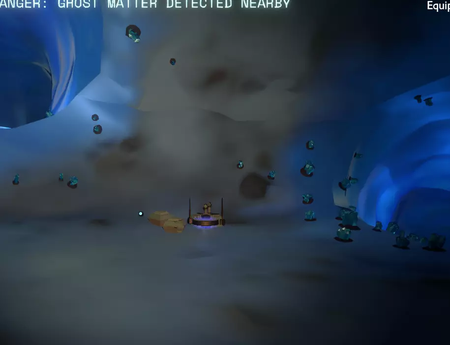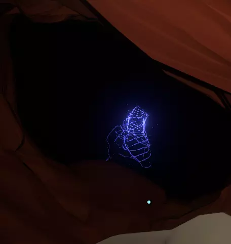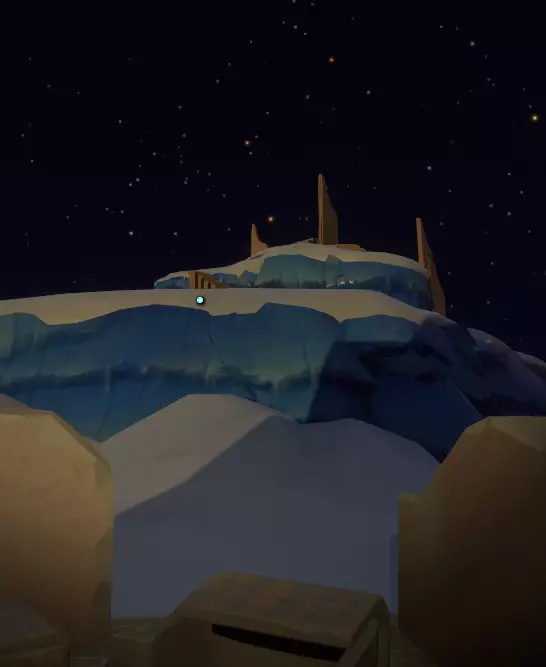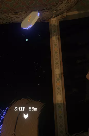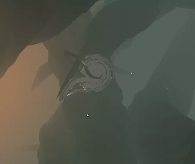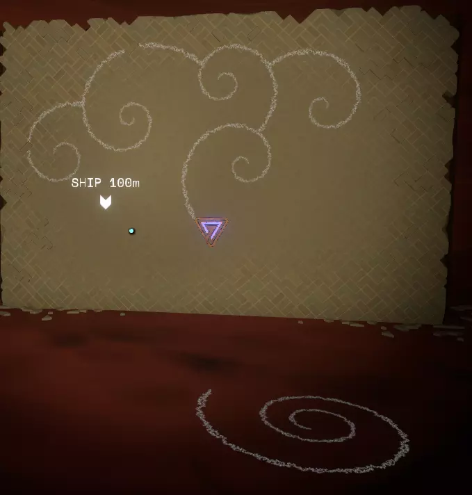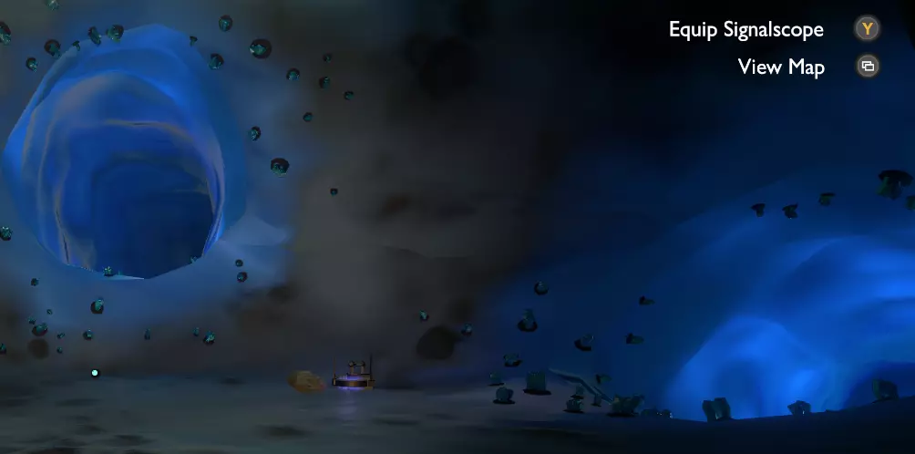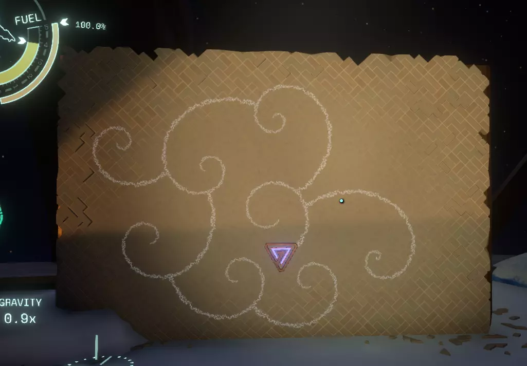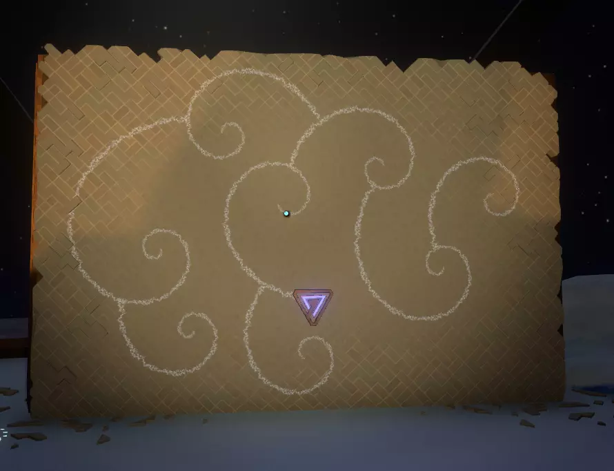 我们这边的工作已经完成了。 如果你的飞船在靠近太阳时没有被炸毁,你可以在彗星上尝试下一部分内容;否则,等到彗星第二次足够靠近太阳时,你的氧气即使没耗尽也所剩无几了。 所以或许你可以冥想直到新循环开始,或者返回主菜单并重启循环。 如果重启循环,当你回到彗星时,(你的飞船日志地图上现在会有冰冻的诺玛飞船标记,所以高亮它可以让你第二次更容易找到彗星。) 降落在朝向太阳的一侧。你要寻找的是降落在岩壁上一些形状非常特殊的凹陷附近。