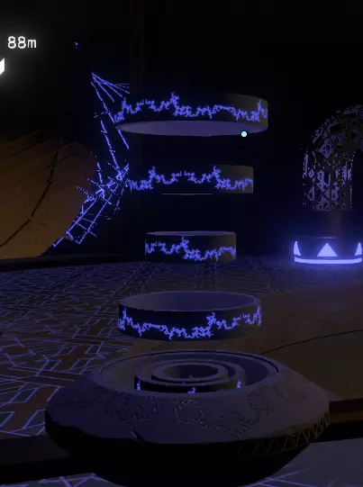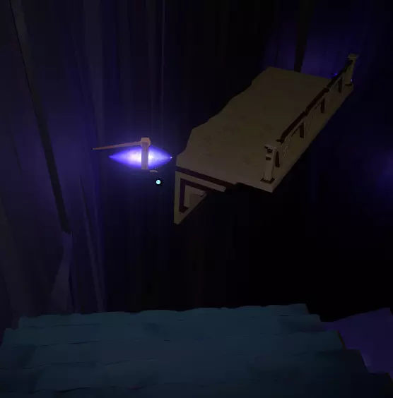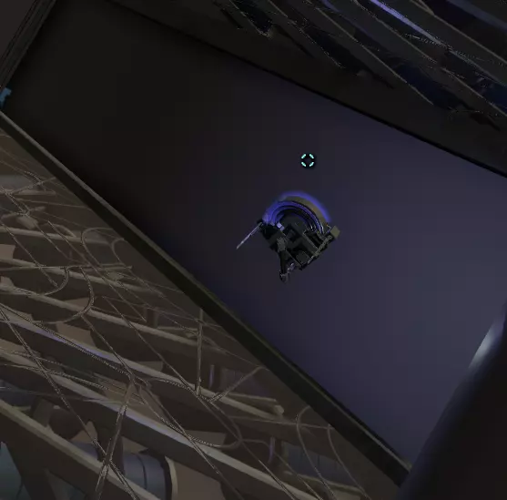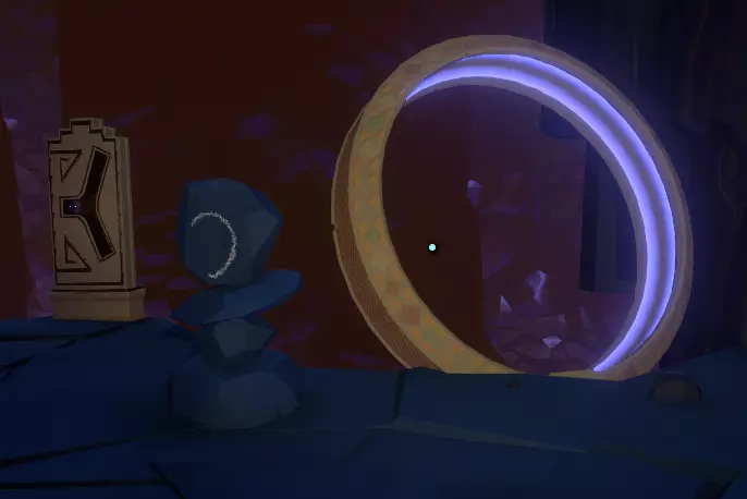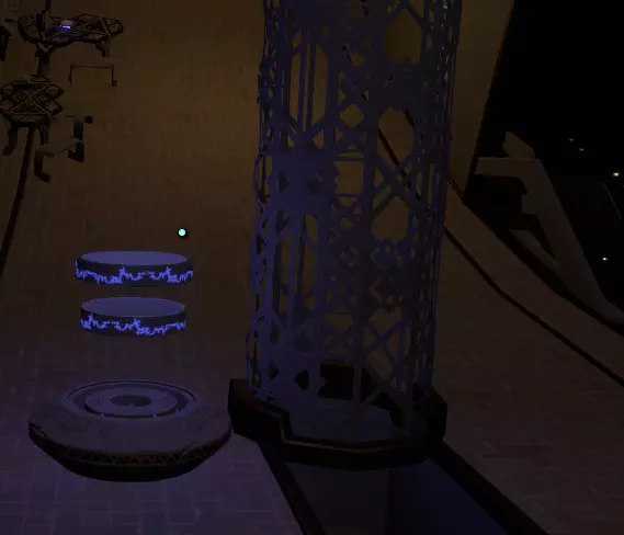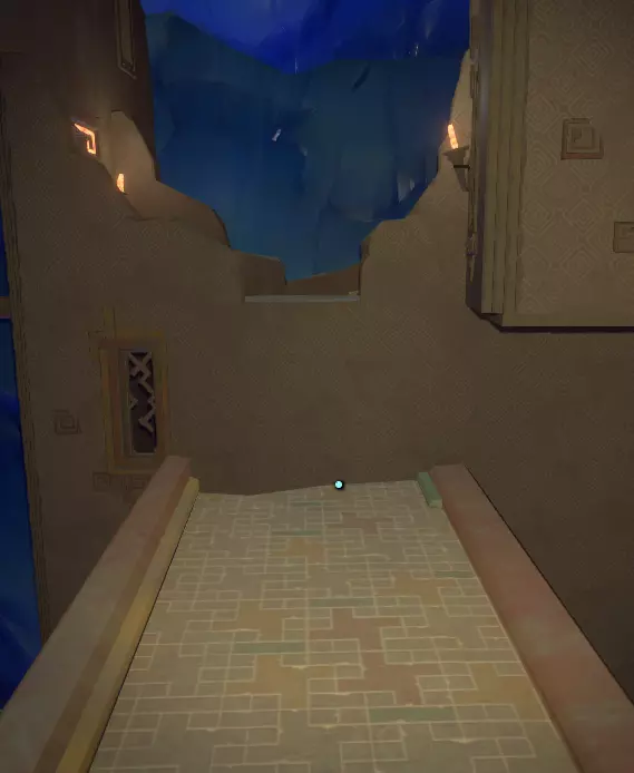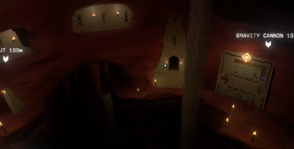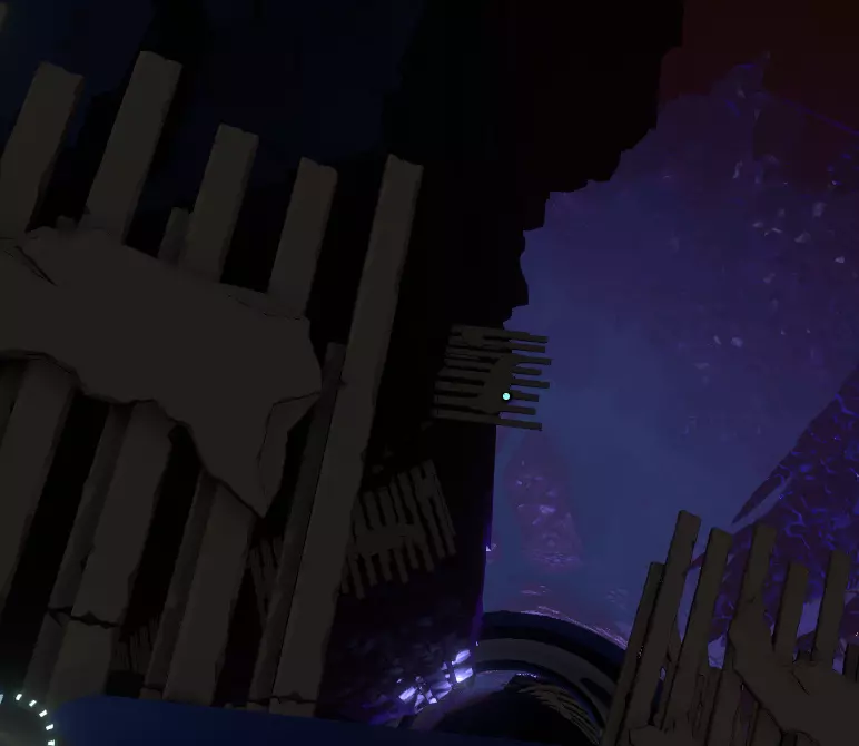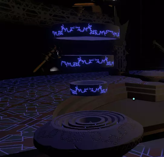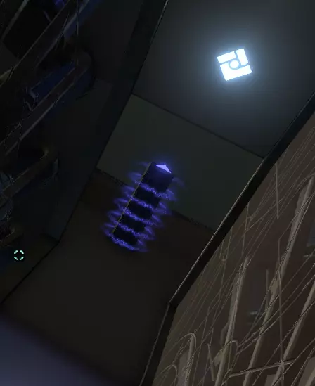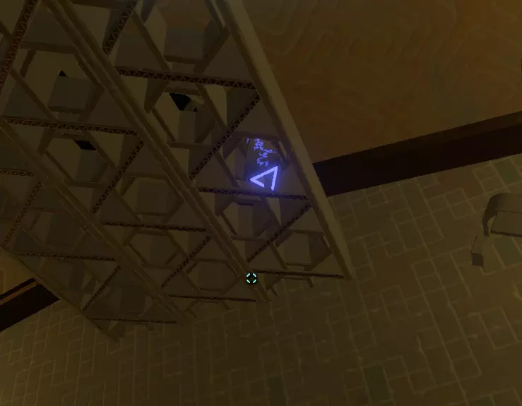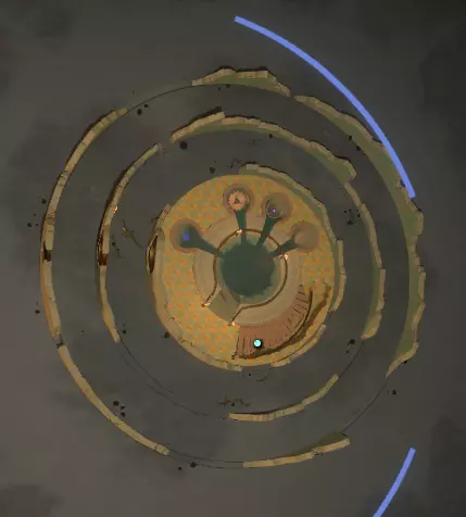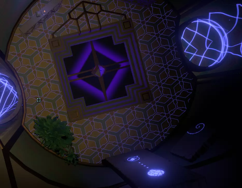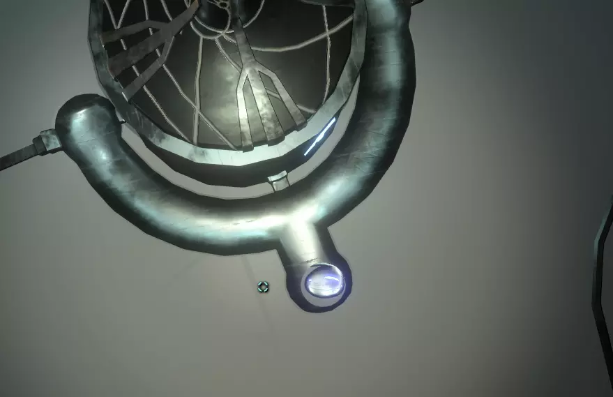 在壁画附近,栏杆上有一处缺口。向下看,你应该能看到更多重力水晶。沿着这些水晶向下前往下一层。 大致在右侧,你会看到一个类似这样的圆形结构: