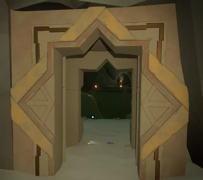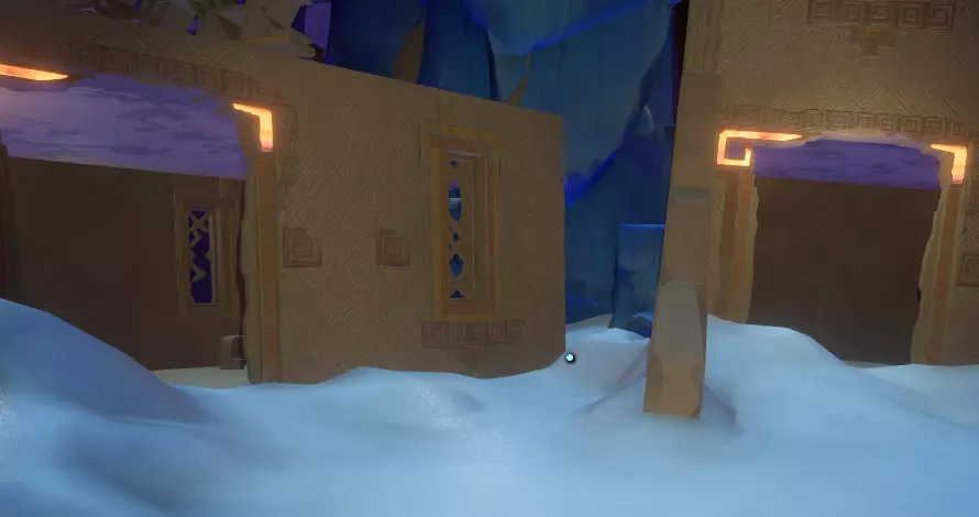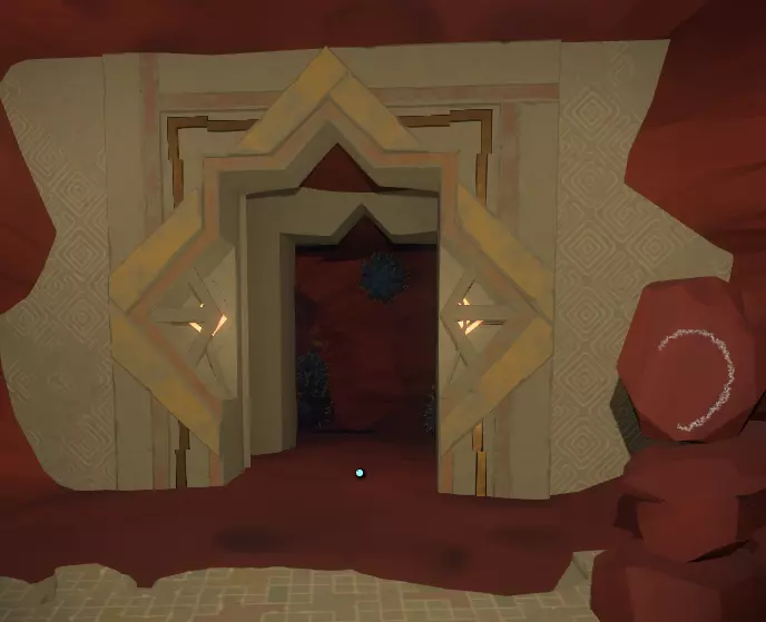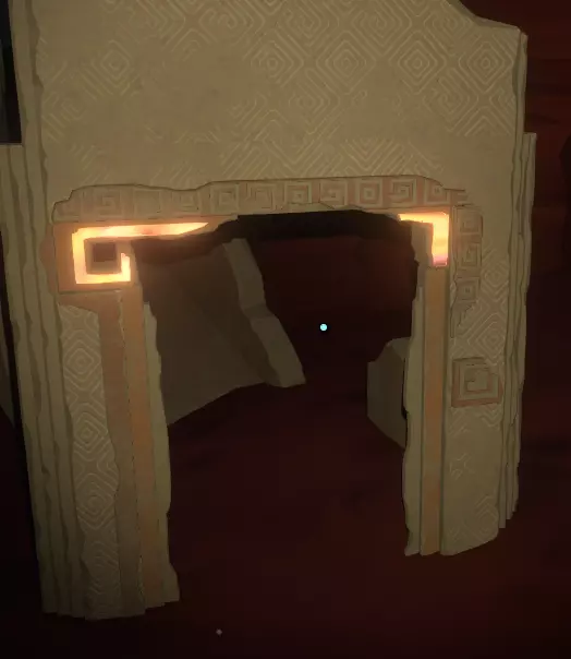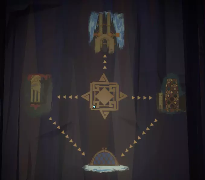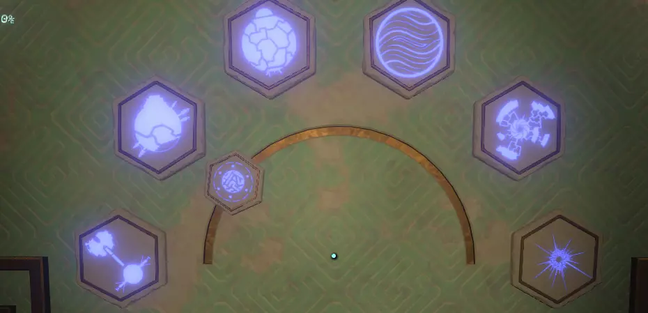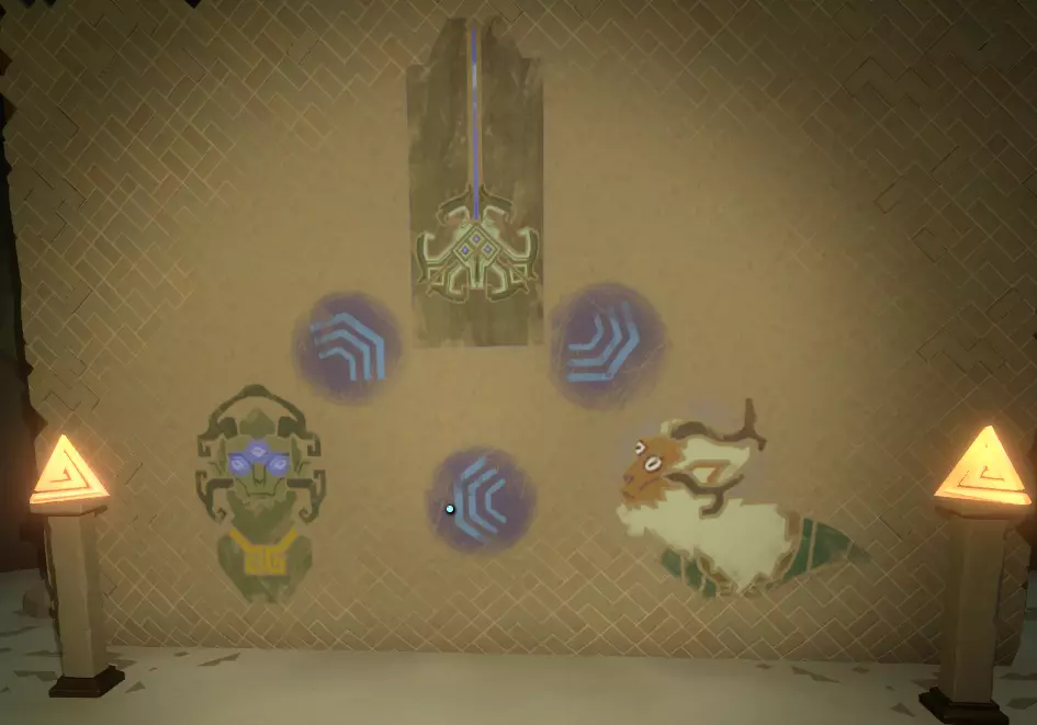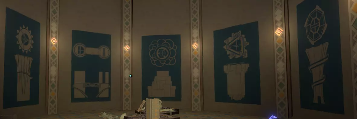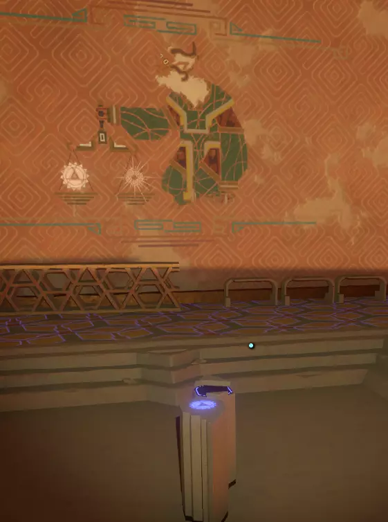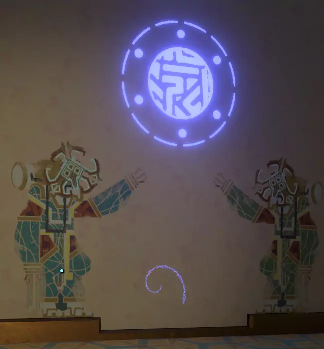 一旦你看到神社,就朝它走去,打开由球体激活的门。你应该也熟悉这种门,因为你之前肯定见过类似的。 左侧墙上有一幅包含三幅图画的壁画,右侧墙上则似乎是代表月亮所经过的五个行星/地点的图标。