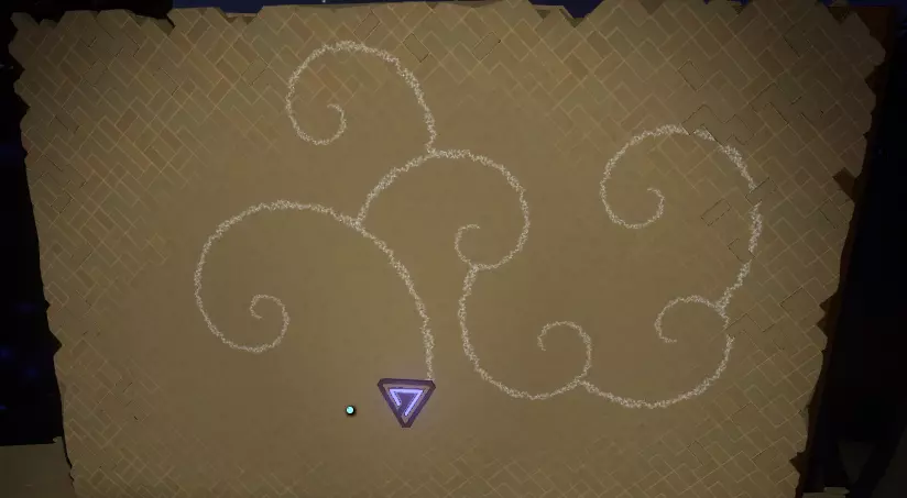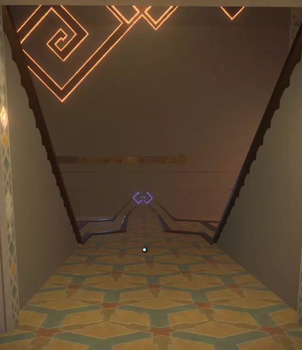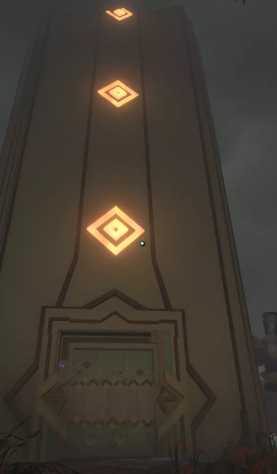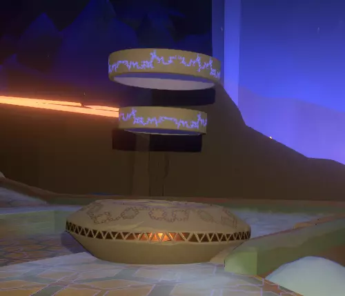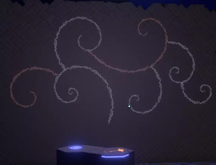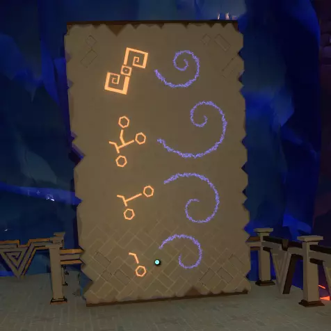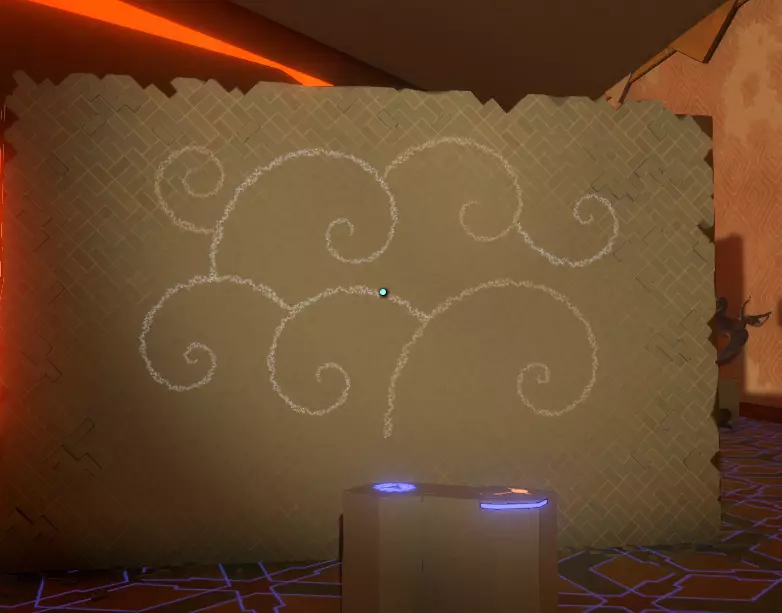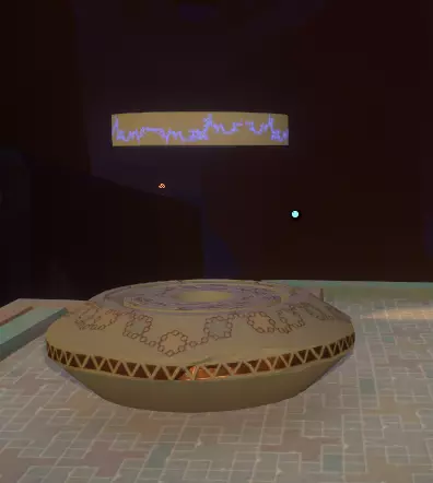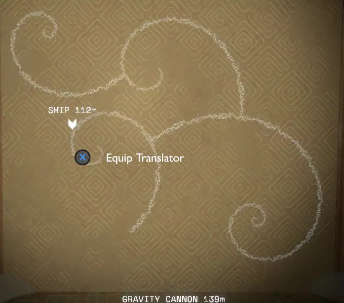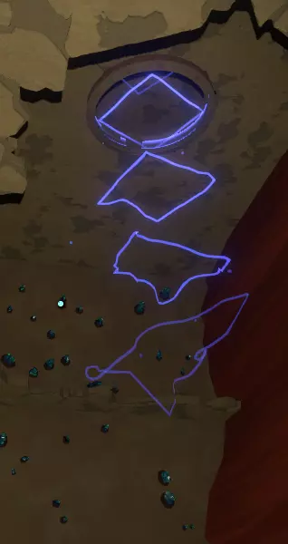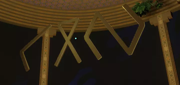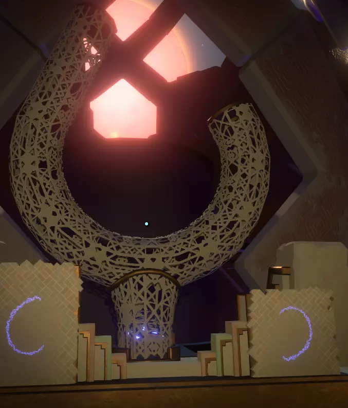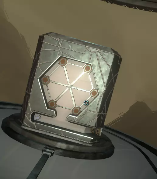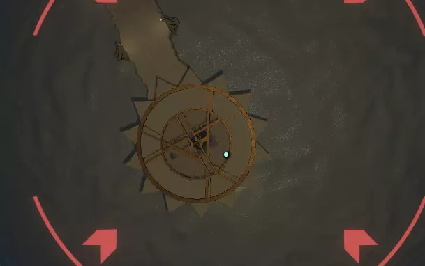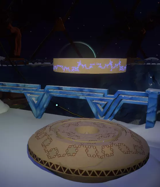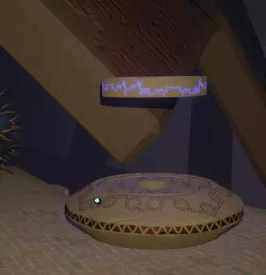地面之上 你会注意到一组奇怪的旋转圆环。在圆环中央,有一个你可以通过注视来控制的球体。你会逐渐习惯这些操作。 将球体移入四个带有图案的槽位,圆环中的巨大圆圈会聚焦并追踪(顺序不定):太阳、碎空星、巨行星,以及一个似乎会导致圆环持续旋转的图案。 地下 有一段楼梯向下延伸,如果你愿意,可以沿着楼梯下去。楼梯尽头的正对面,是另一面刻有更多未翻译的诺玛文字的墙壁。
