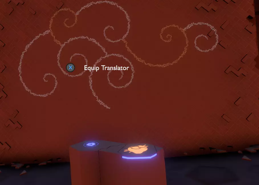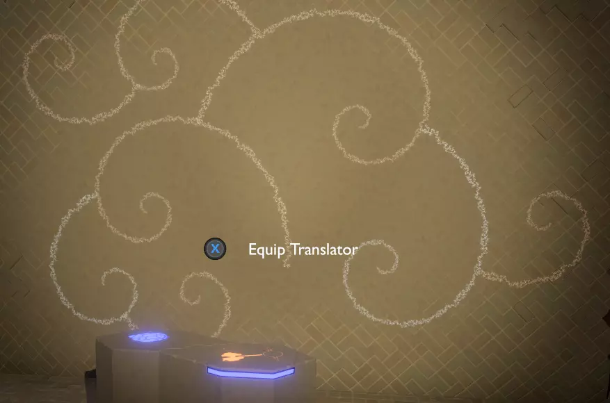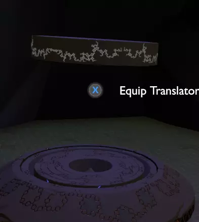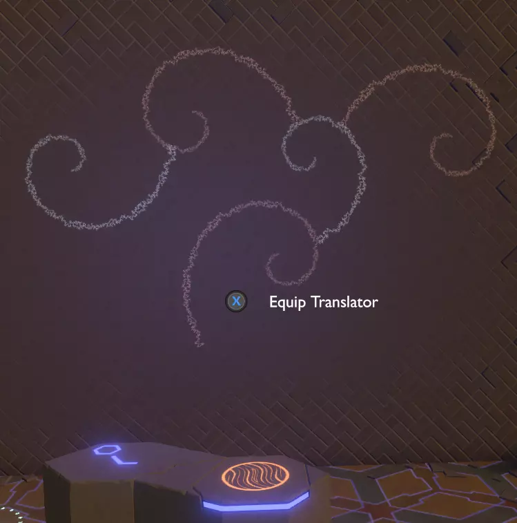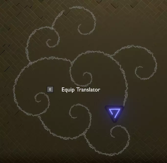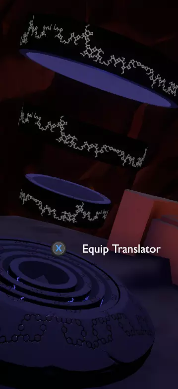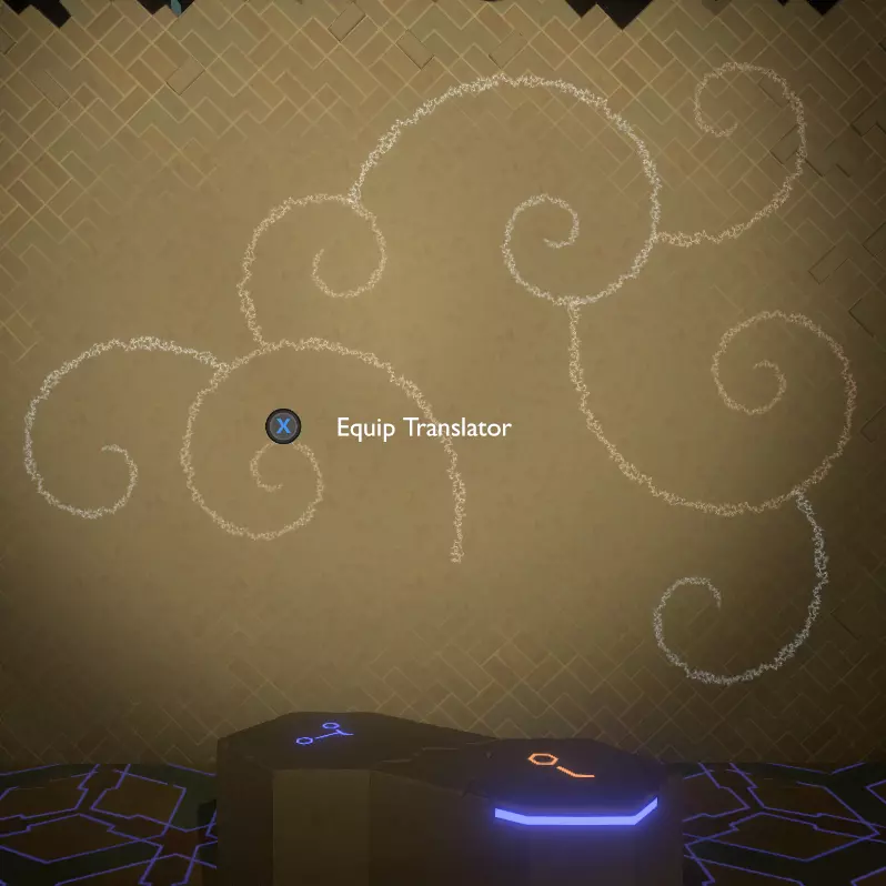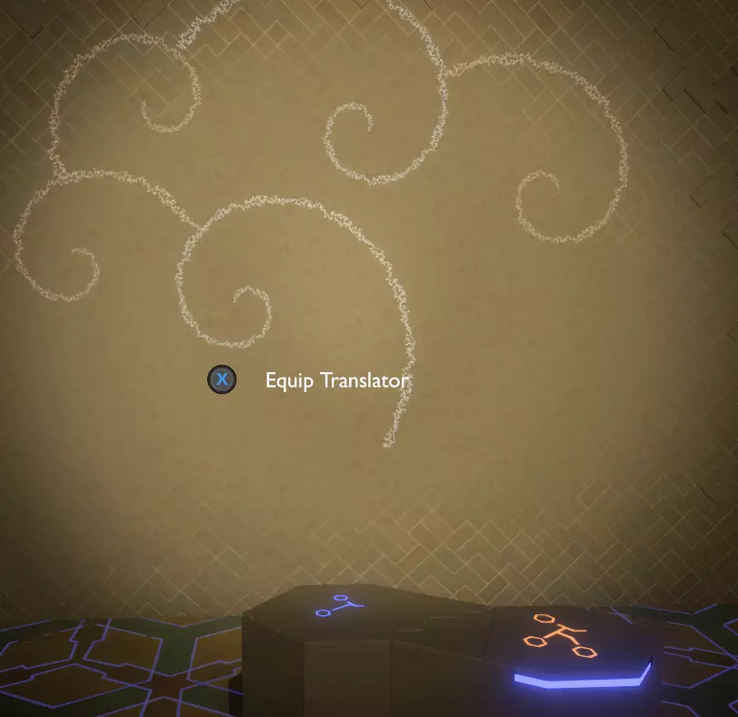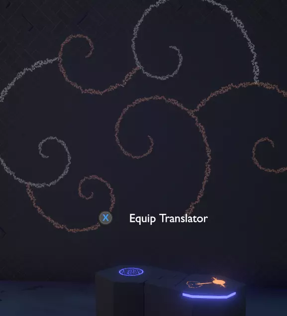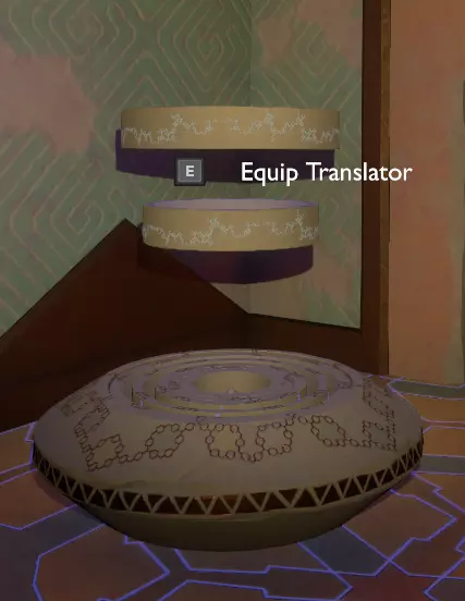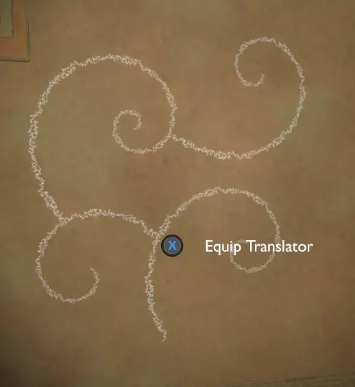 门附近有一块刻着奇怪符号的石头。如果你还没有探索完博物馆里的所有展品,这将是你第一次接触到诺玛文字。它会显示为【未翻译的文字】。幸运的是,你有一个方便的设备可以翻译这些东西,装备它并按下提示按钮。