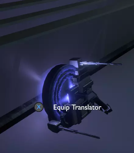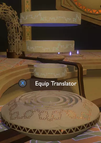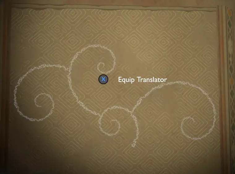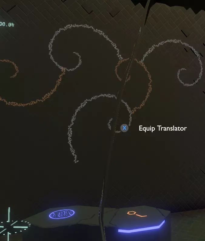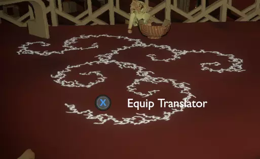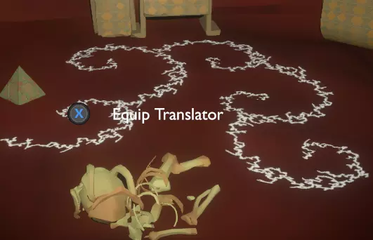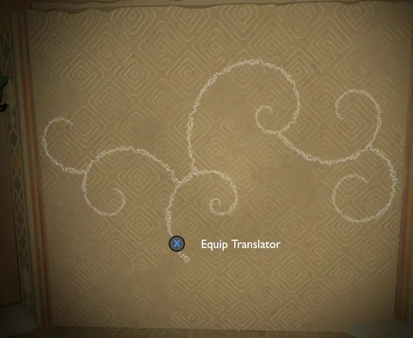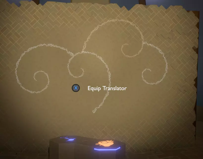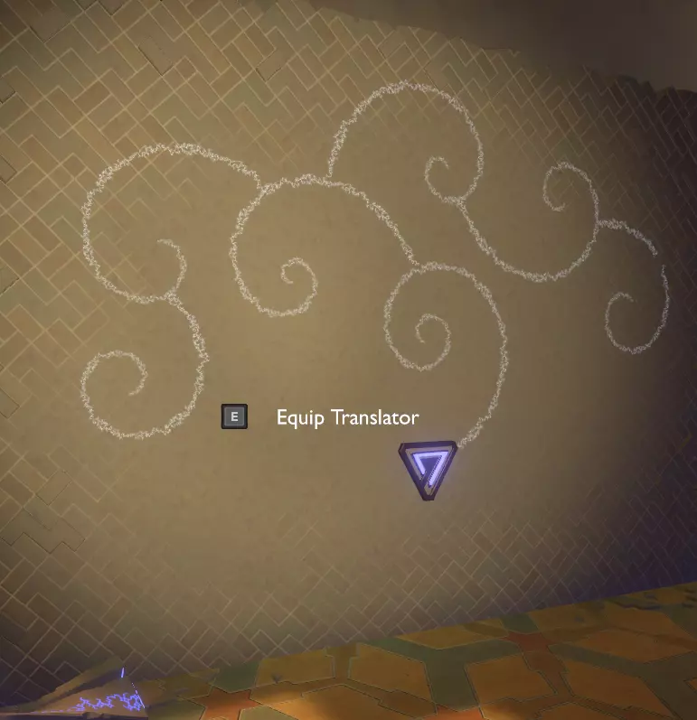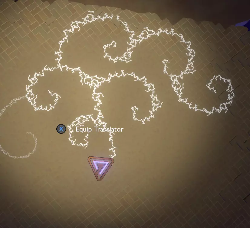 门附近有一块刻着奇怪符号的石头。如果你还没有探索完博物馆里的所有展品,这将是你第一次接触到诺玛文字。它会显示为【未翻译的文字】。幸运的是,你有一个方便的设备可以翻译这些东西,装备它并按下提示按钮。