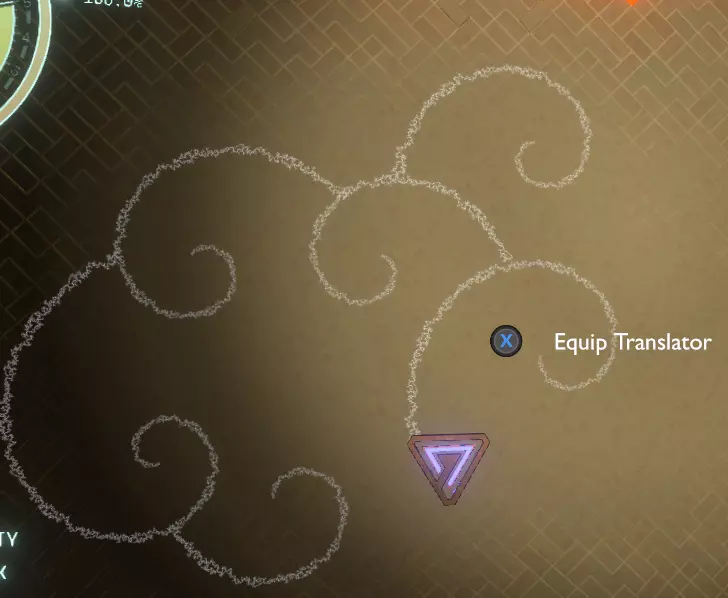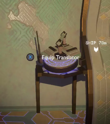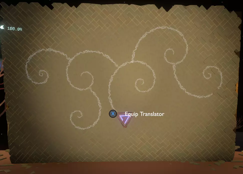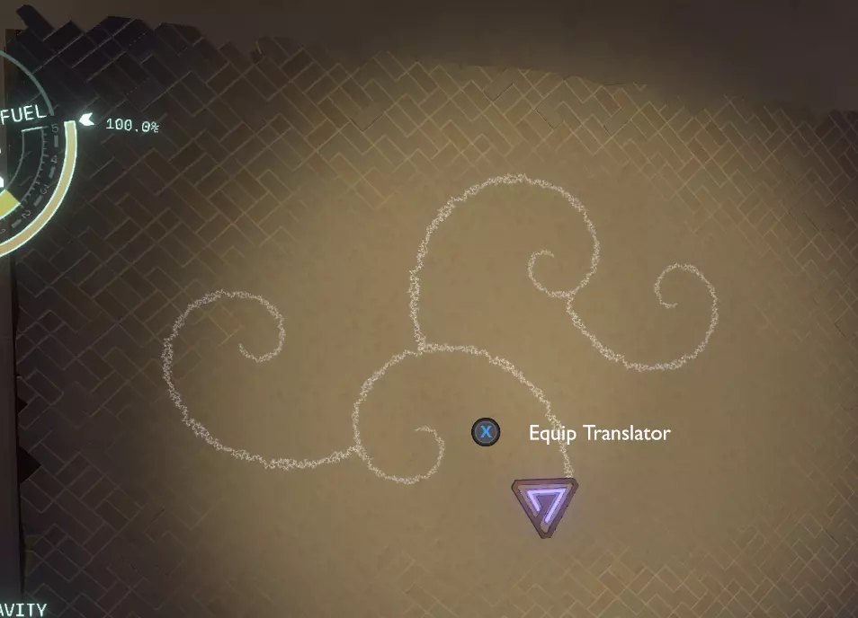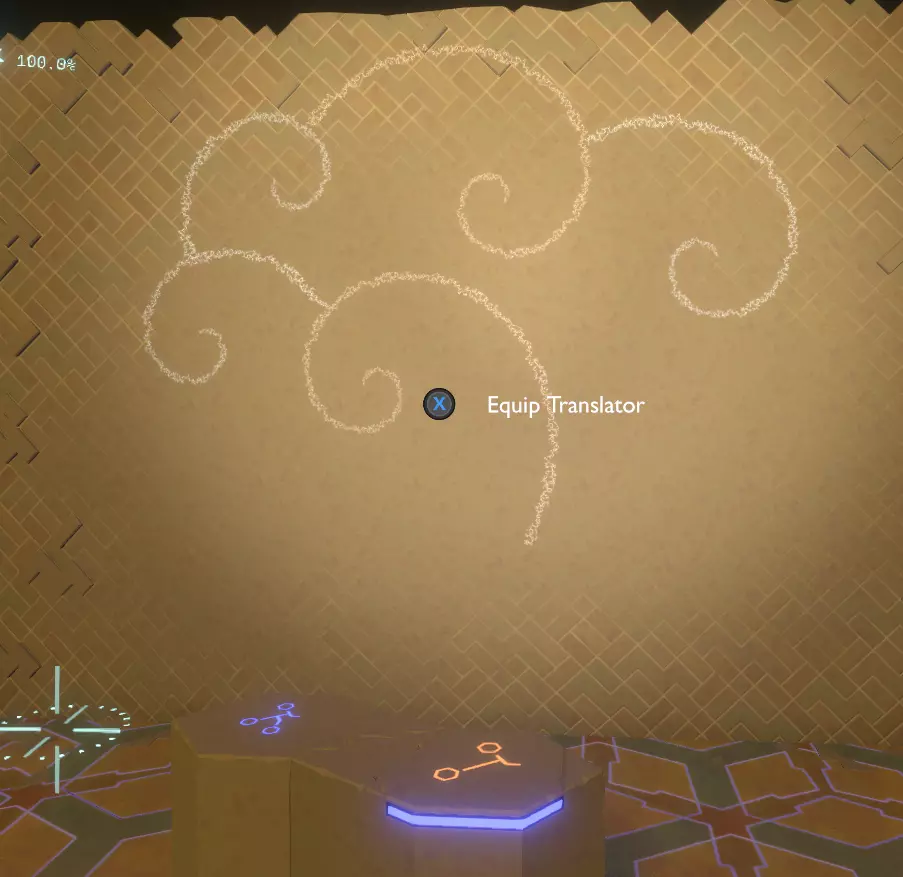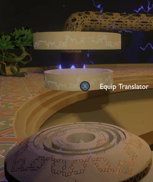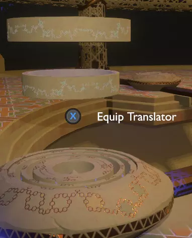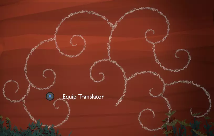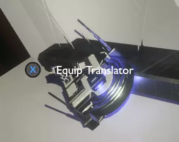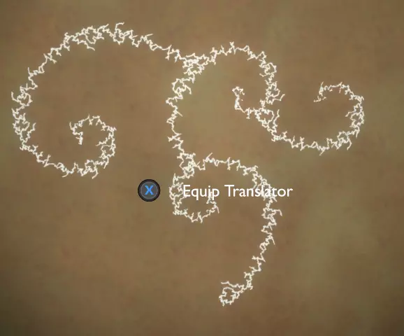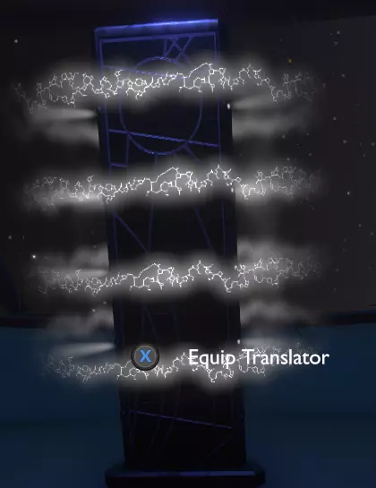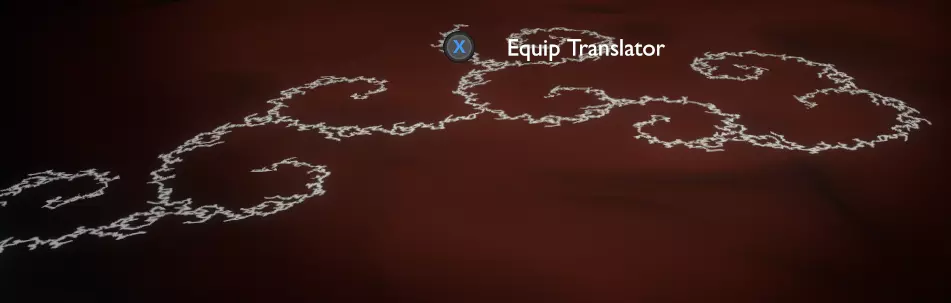 门附近有一块刻着奇怪符号的石头。如果你还没有探索完博物馆里的所有展品,这将是你第一次接触到诺玛文字。它会显示为【未翻译的文字】。幸运的是,你有一个方便的设备可以翻译这些东西,装备它并按下提示按钮。