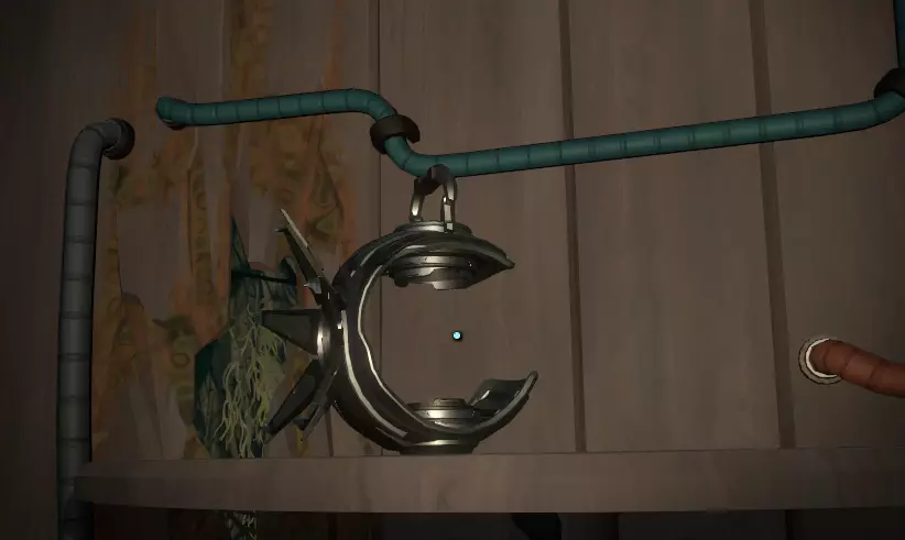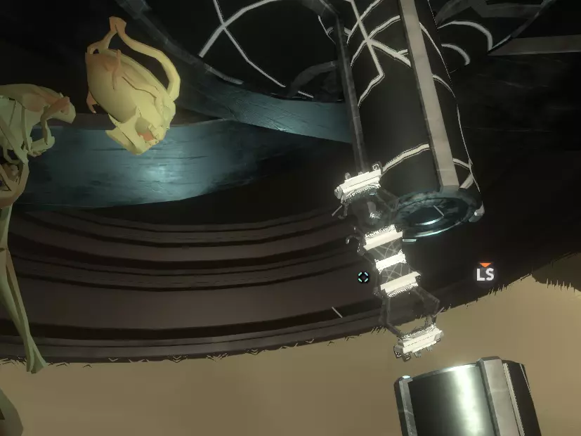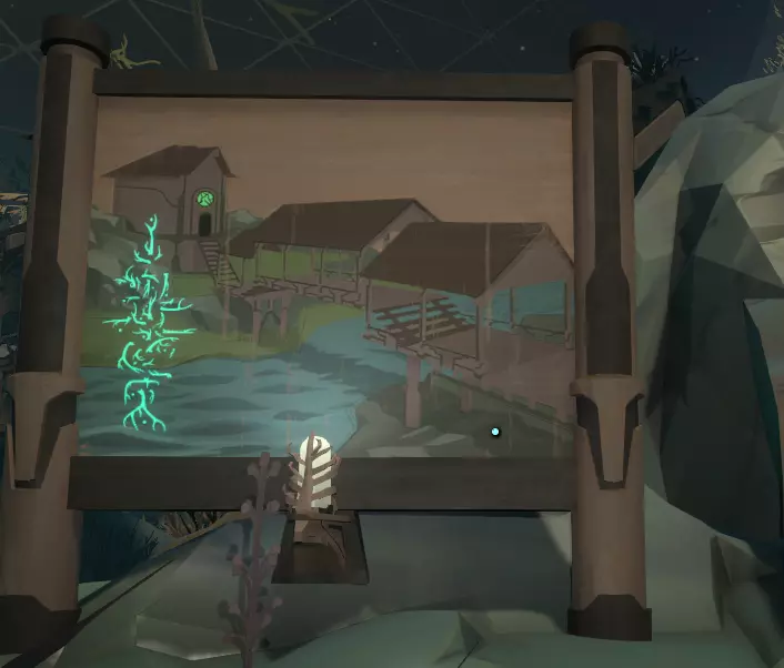 收集这个并返回装置处。现在你会发现可以将“幻灯片卷轴”插入装置顶部,这是一台投影仪!投影仪需要光源,所以打开手电筒,屏幕上会出现部分图像,该死,光线肯定不够。我们需要更大的光源。从你进入的门口出去,穿过有顶的桥回到“画廊”,在地上找到一盏灯,还有其他的灯,每幅图像附近各有一盏。拿起一盏灯走回投影仪处。会弹出提示“插入灯泡”。插入灯泡后,下到下方的杠杆处,找到带有“使用界面”说明的迷你船舵装置。画面以一张巨大的行星图片开始,你需要按照屏幕上的指示旋转设备,之后会看到一系列近乎动态的图片,它们讲述了一个故事。 在你看完整个胶片后,你的飞船日志应该会更新,先不要走太远。取出胶片,回到你找到第一个胶片的楼梯处,拐角附近还有另一个胶片,重复上述操作。