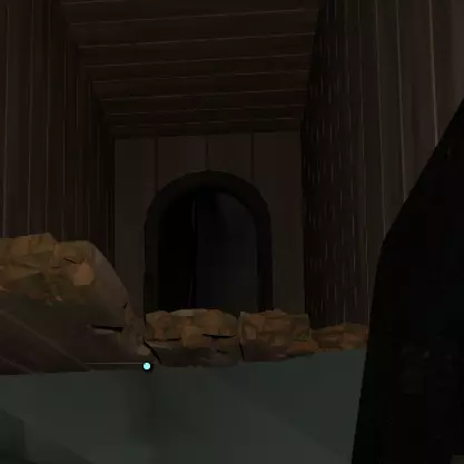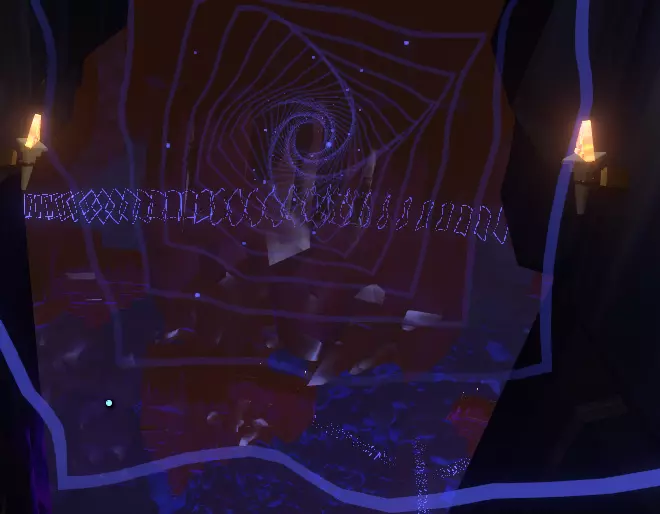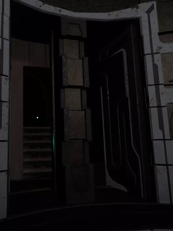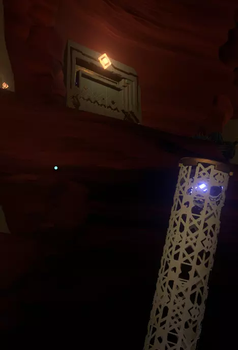 你会在一根柱子上发现一些你的翻译器无法识别的文字。文字后面有一个类似管道的东西,中间有个装置,你或许能看到对面有一扇门的轮廓。关闭手电筒再打开,让栏杆旋转,直到门弹开。