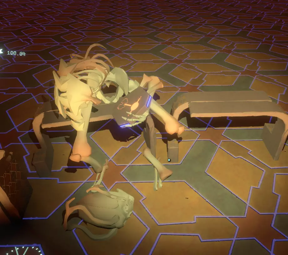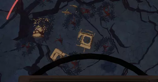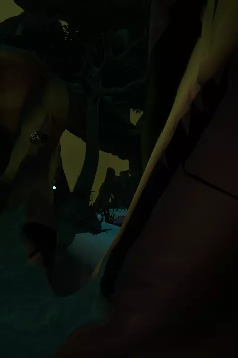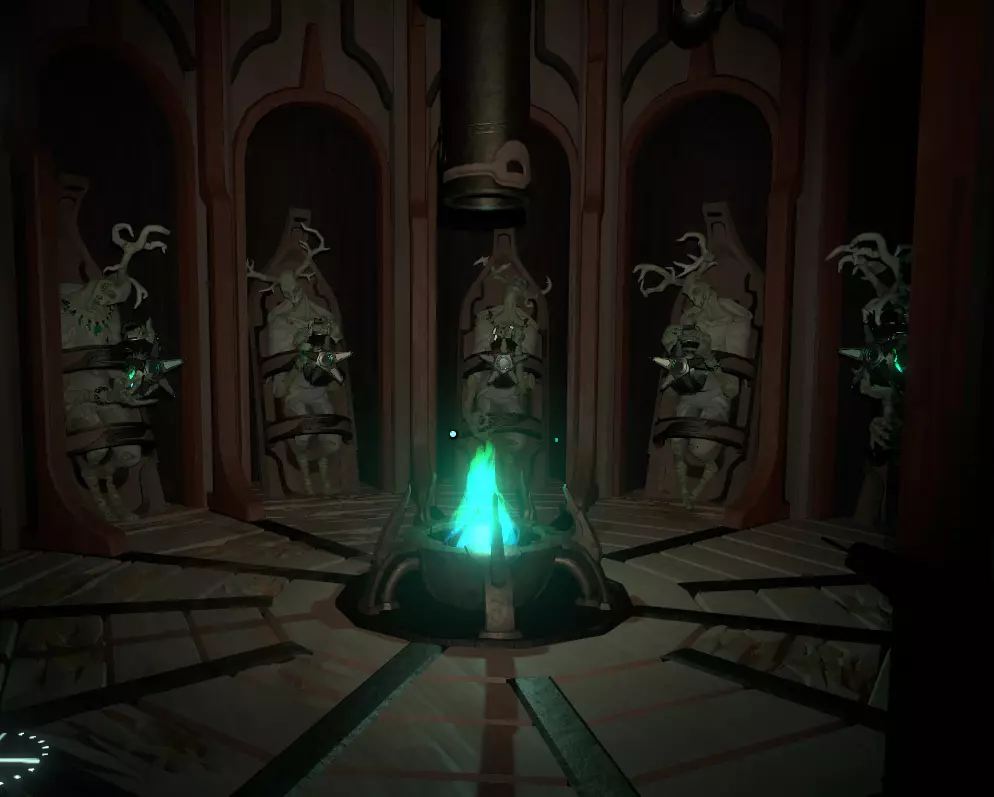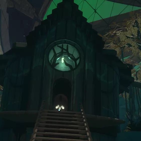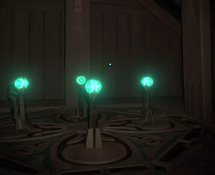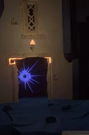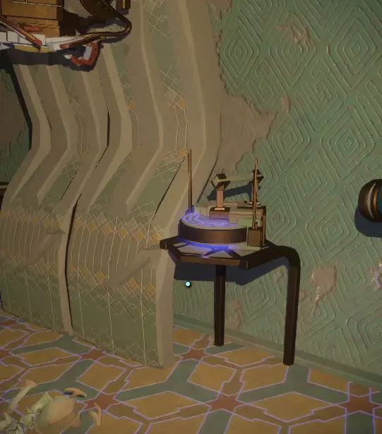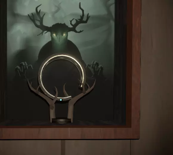 这是神器。 现在,该怎么处理它? 带上它,原路返回,前往画廊屋(就是你最初找到灯的那个满是画作的地方)。 寻找一幅画着带环行星的画(它会动),移开灯笼,周围会变暗。趁暗时,拿起神器并跳上画中的窗户,往里走一点,你会看到一组向下的楼梯。 沿着楼梯往下走。 在楼梯底部,你会看到一堆绿色的营火和一堆被捆绑的骷髅!