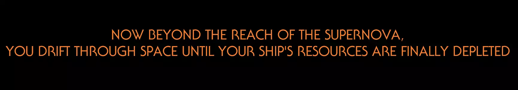 字幕将会开始滚动,不过好在这些字幕可以跳过。 【迷失太空】要达成这个结局,你需要能够到达灰双生子计划。其实这并不难,实际上只要灰双生子 warp 塔从沙中露出(每个循环约4分钟时发生),你几乎可以在循环中的任何时候完成。 首先,在你醒来的营火旁小憩四分钟,然后登上你的飞船,前往灰双生子和灰双生子 warp 塔(就是那个双尖塔,其中一半是破损的)。在角落里等待,直到沙柱从头顶经过,然后向前走到 warp 点上。 进入灰双生子计划内部后,移动球体以打开上方的容器,然后使用另一个球体来关闭重力。轻轻向上喷气并获取高级曲速核心,然后返回你的飞船。现在,一旦进入飞船,就拼命朝着太阳系的外围飞去,尽可能飞得远。 由于没有高级曲速核心来启动重置,当太阳变成超新星时,应该不会发生任何事情,最终你会看到以下画面。