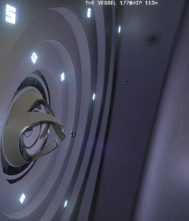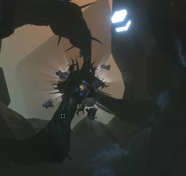 阅读完这段内容后,尽量靠近种子并向内部发射探测器。你的飞船日志应该会自动更新(我没有收到相关通知),如果愿意的话,可以用相机四处观察,能看到部分嵌入的航天器。 先不要召回探测器,这也是为什么你最好驾驶飞船沿着那条轨迹前进,因为我们要(间接)跟随那个信号前往【The Vessel】。 【The Vessel】 我知道我之前说过,在“暗荆棘”区域开始时也提过,这里会变得很吓人;这个地点绝对是我们探索过程中最令人恐惧的部分。 所以,穿上备用内衣,紧紧抱着你的泰迪熊或安全毯,做好最坏的打算,我们要进去了!我们的侦察信号仍在激活中(希望你没有关闭信号源)。前往你的侦察信号位置。你应该能看到前方有一个淡红色的点。