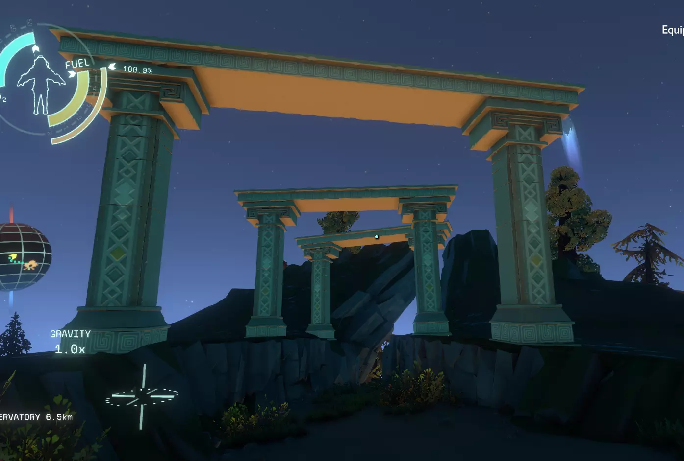 如果你愿意的话可以读一下,但还是先上楼吧。 你会来到一个屋顶,前方不远处有一栋建筑,你需要飞过去并进入那个洞口,记得使用推进器减缓下落速度,这样你就回到了我们进来的地方。 碎空星重力炮(及南部天文台) 如果你在碎空星上空飞行过一段时间,而且如果你是按照本指南操作的话,那你应该已经飞了相当久了,你会看到一个看起来像巨大空心针的结构。
