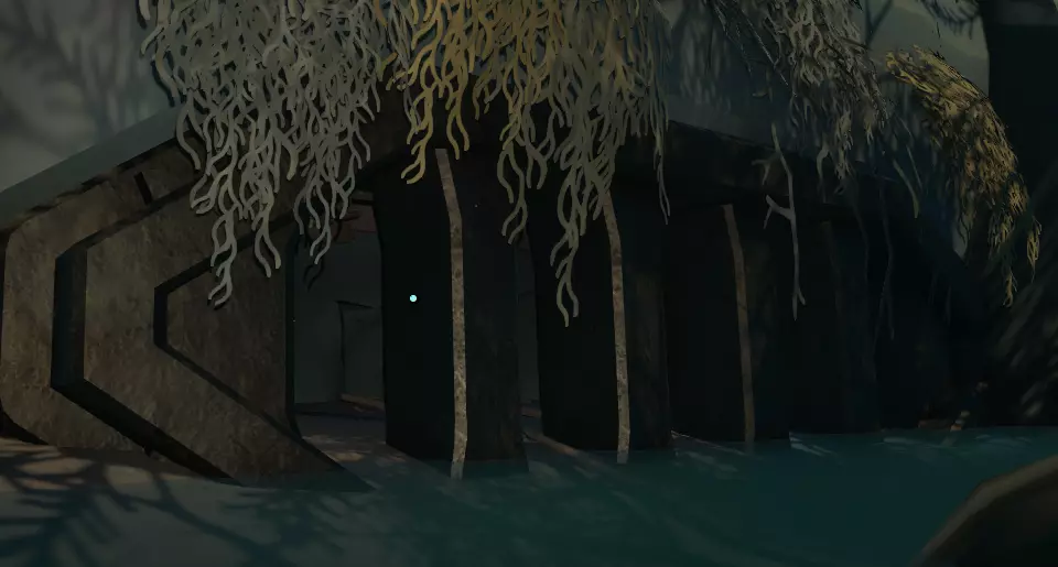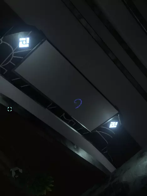 在这段影像的结尾还有另一个更新。 现在我们准备离开这座建筑。 当我们在河流低地时,还有其他东西可以探索——【滑梯燃烧室】,它隐藏得相当巧妙。 找到它最简单的方法是从你观看影像的观影室开始。 在屏幕旁边的另一侧,有一扇带灯光激活锁的门,打开你的头灯,直到旋转的部件与太阳图标旁边的槽口对齐,门就会打开。 现在走到阳台上,跳过或用喷气背包越过栏杆,朝着水坝的方向前进。 这个“秘密”地方的入口巧妙地隐藏在芦苇和树木之间。 你要找的是一棵根部延伸到岩石上的树。