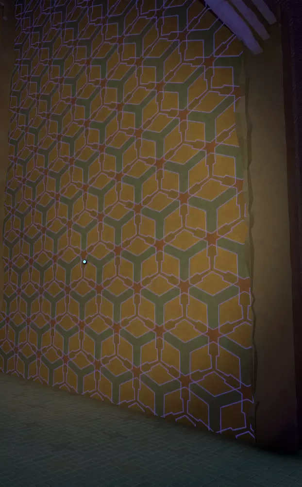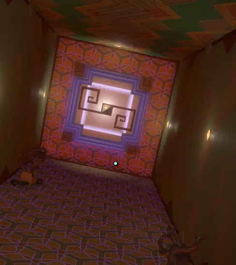 中央竖井入口 一直往前走,你会看到两个垂直的电梯井。 井内有一面带图案的墙壁。