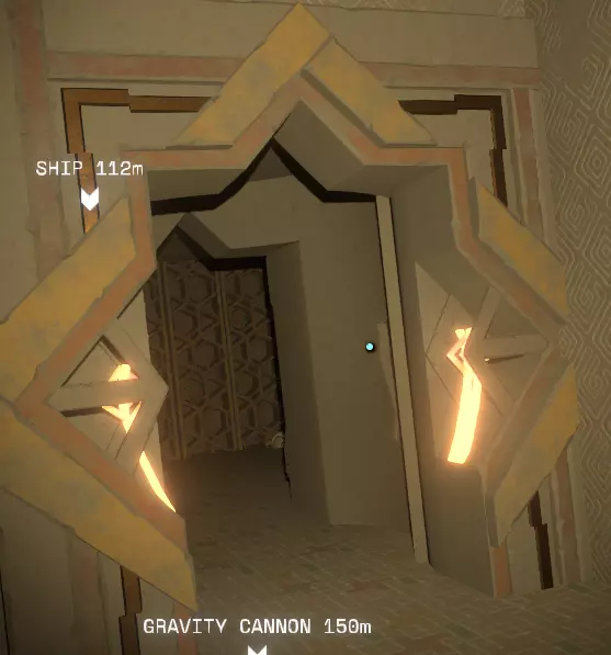 你会看到这些向下延伸的走道。 这里你需要快速、持续地移动,可能还得稍微用一下喷气背包。 沿着走道往下走。大约经过三个走道后,你会看到一个可以停下来的小壁龛,地上有一盏灯和一份诺玛文字。 上面写着:“别滑倒,你脚下是一个【黑洞】! 什么?! 继续往下走,直到到达坚实的地面,然后沿着小路前进。 在这里你会发现另一段诺玛文字,上面写着从这里开始道路是稳定的。 欢迎来到【旧定居点】。 在你正对面的走道上,透过一扇门,你可能会看到一个蓝色的太阳图标。