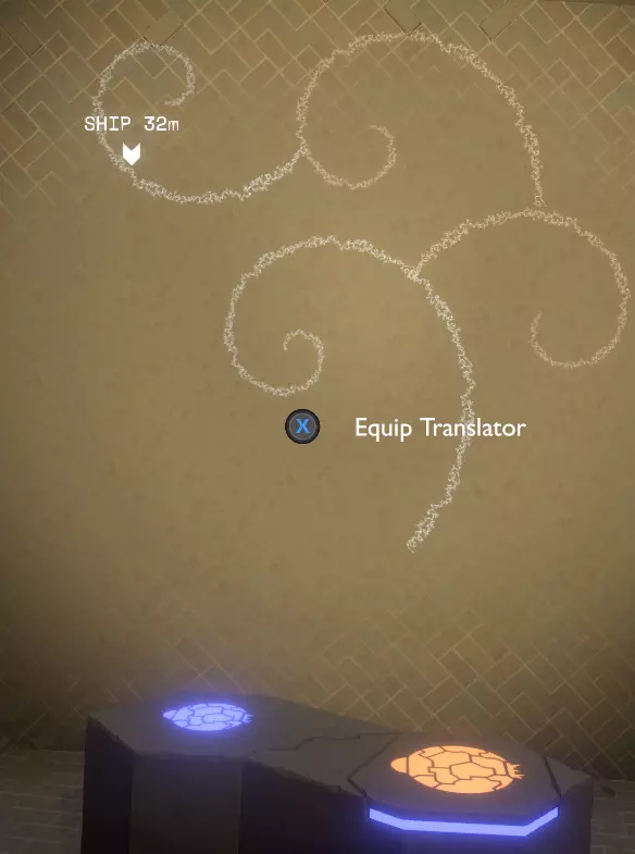 翻译这些环以获取更多飞船日志更新。前方不远处是一堵长墙,上面有八段独立的诺玛文字。