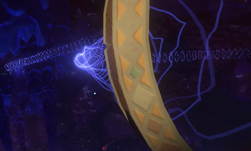 它还像带电的电线一样滋滋作响。 但它下方有一个进入藤蔓的入口。 把船停在靠近飞船的地方,不要太近,原因应该很明显。然后下船,朝那个藤蔓入口走去,注意不要碰到费尔德斯帕的飞船。 进入藤蔓后,你会看到左边是藤蔓的尽头,而右边则可以继续前进。 向右走。 不知为何,当你沿着藤蔓移动时,你的星球地图会消失。继续前进,藤蔓似乎在你周围逐渐收缩。 在某个位置,你会被传送到其他地方,这时你的星球图标会重新出现。 继续向前走,直到你来到一个结冰的平台,走上去并沿着平台绕行。 前方,你会看到一只死去的水母和一段 hearthian 录音。