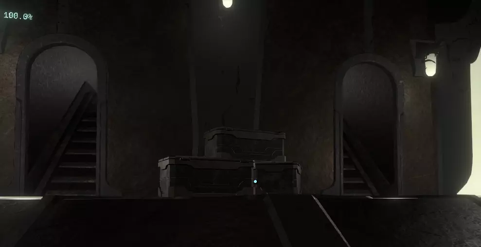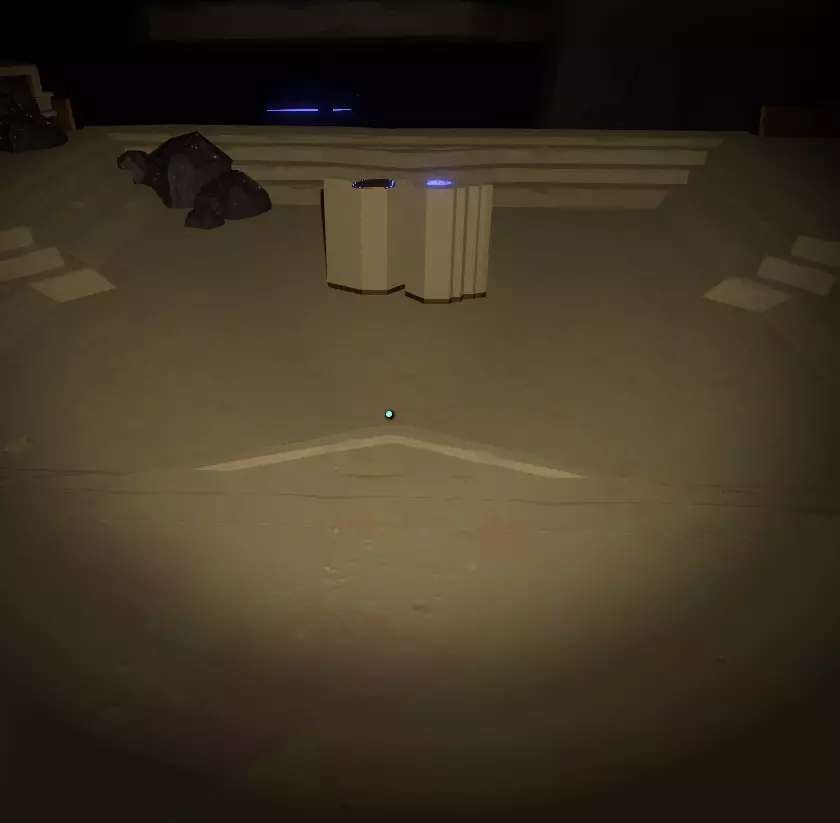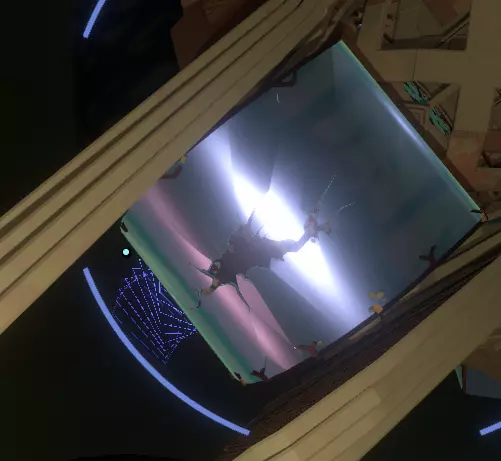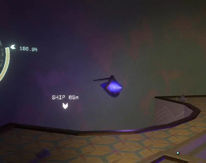 这是量子塔的底部。 如你所见,无法从这里进入量子塔,因为你根本无法获得足够的推力到达足够的高度。 另有一条路。 这需要你在循环接近尾声时回到塔的顶部外侧。 如果塔还在那里,降落在塔顶,向塔内发射一个探测器,随便射在墙上哪个位置都无所谓。 现在待在你的飞船里,直到探测器的读数显示地面稳定性下降到5%左右。然后离开飞船或留在飞船里,直到稳定性降至0%。如果在塔坠入黑洞时你在飞船外,你会以近乎神奇的方式被传送回飞船内。当你回到太空后,寻找你的侦察兵信号位置并朝它移动。你可以穿过之前在基地看到的缝隙,然后转向并轻轻推进,向上进入量子知识之塔内部。不用太在意一楼,那里有一个投影池和一面文字墙,但它们都没什么用。继续上到二楼,在架子上可以找到一卷卷轴。