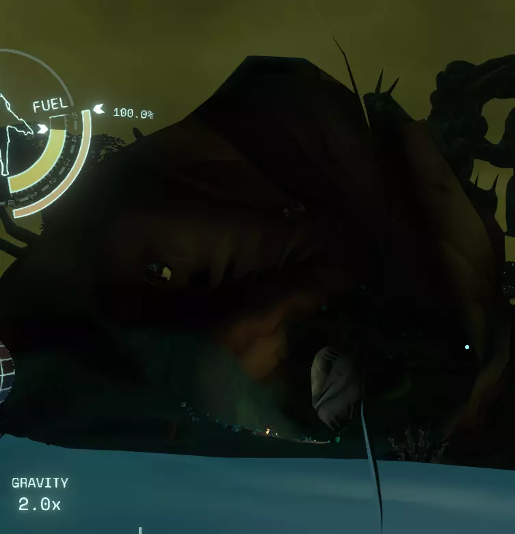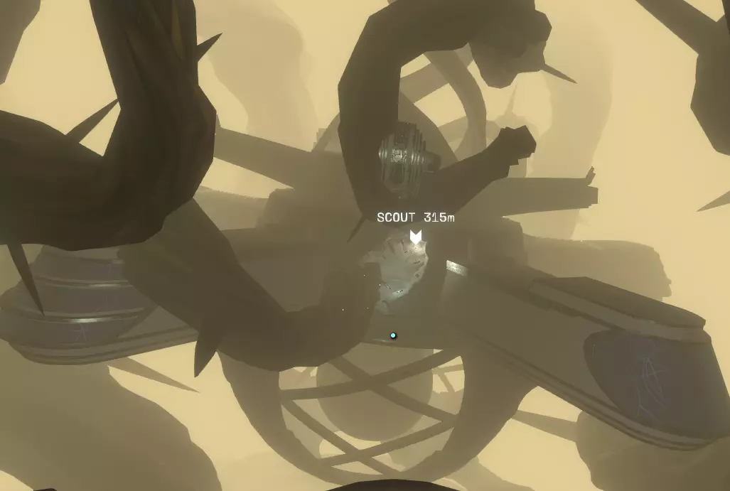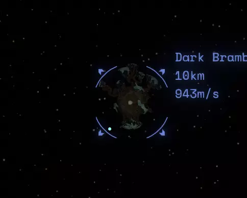 如果你一直在按照本指南操作,那么你应该已经在木炉星和巨行星上见过暗荆棘的一些类似物了。现在我们要与真正的暗荆棘正面交锋。暗荆棘有多个入口,其中一些入口与你能在暗荆棘内部发现的不同事物有关。我们的第一站是寻找最后一位 hearthian 探险家——费尔德spar。不过,在离开木炉星之前,我们要先绕个路去木炉星上的冒烟陨石坑。如果你以前没来过这里,现在正是绝佳的机会。找到陨石坑后,在坑内或坑外着陆,然后前往我们的 hearthian 同伴站立的地方,他就在一颗荆棘种子附近。拿出你的侦察兵发射器,向种子的白色孔洞发射一枚侦察兵。【不要召回侦察兵!】很快你就会明白原因。现在起飞,前往暗荆棘本体。当你飞向该星球时,会注意到侦察兵正在发出双重信号:一个来自 Timber Hearth,另一个来自其他地方。朝着第二个信号前进,并且确保在距离星球【至少6公里】处减速,因为撞上树枝会损坏你的飞船。当你足够接近时,会看到一个巨大的浅白色区域;信号似乎就是从那里发出的,所以慢慢飞进去。进入内部后,视线会受到限制,这里充满了浓雾和发光的白色光点。这里不建议高速飞行,除非你足够鲁莽,并且觉得自己刚从顶尖飞行学院毕业,能驾驶大型喷气式客机穿过针眼! 继续跟随侦察信号,保持从容。 你会遇到另一个带有白色入口的种子,飞进这个入口。 现在你会注意到屏幕上有三个重复的信号。接下来需要一些尝试、摸索和发现。 飞向其中一个(对我来说,是屏幕最右侧的信号)。当你靠近每个信号时,会看到另一个种子和白色圆形入口。 只有一个入口足够大,能让你的飞船真正进入。这也是为什么你要从容不迫,不要像一头冲向闸门的公牛一样匆忙。 再次进入那个乳白色的区域。这次只有两个信号,它们几乎完全重叠在一起。朝着任意一个信号飞去,直到你开始看到巨型安康鱼的骨架。在它的嘴内部,你应该能看到一个营地。