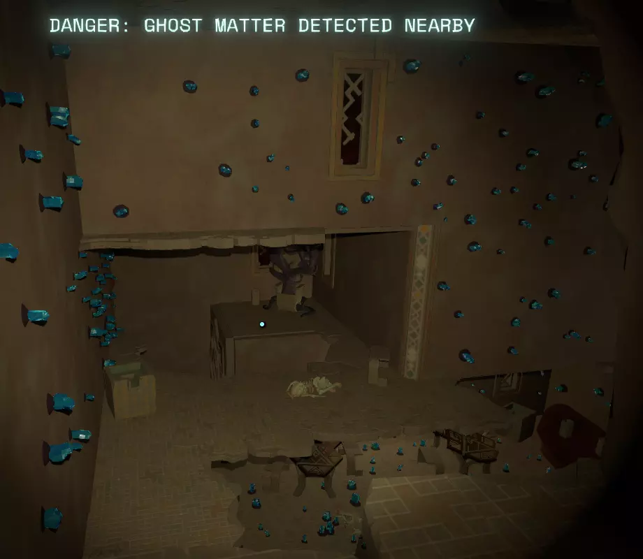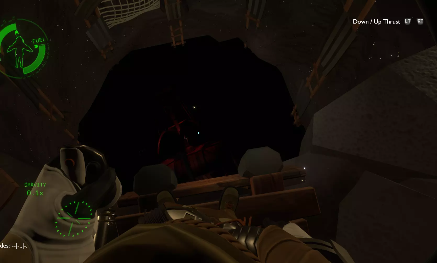 小心前进,因为往前走一点路就会分叉。快速向两边发射探测器。在左边,当探测器经过时,你会看到一个绿色的记录和一个(!)警告标志出现。 走右边的隧道。 你会遇到另一个岔路,再次快速发射探测器,它会告诉你哪条隧道是安全的。 走左边的隧道。 这条隧道的尽头有一个你不想掉下去的地板洞,而是寻找右上方稍微偏上的一个开口。 上去后,沿着路走,直到你发现一个诺玛伊人(Nomai)的尸体卡在地板的裂缝里,哎呀,看来他/她短期内是回不去穿梭机了。