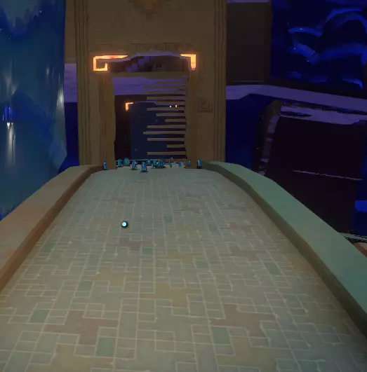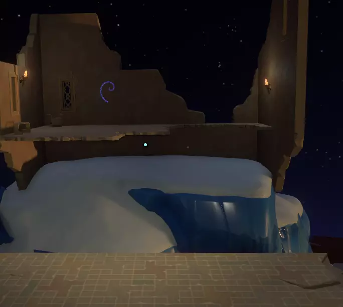 继续前进,找到一个空心柱子,它连接着一个带有蓝色宝珠的通道。将宝珠一直移到柱子顶部,地面会升起两个圆盘,你上方的旋转装置也会打开。