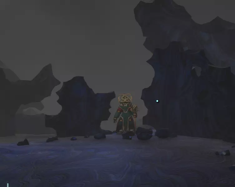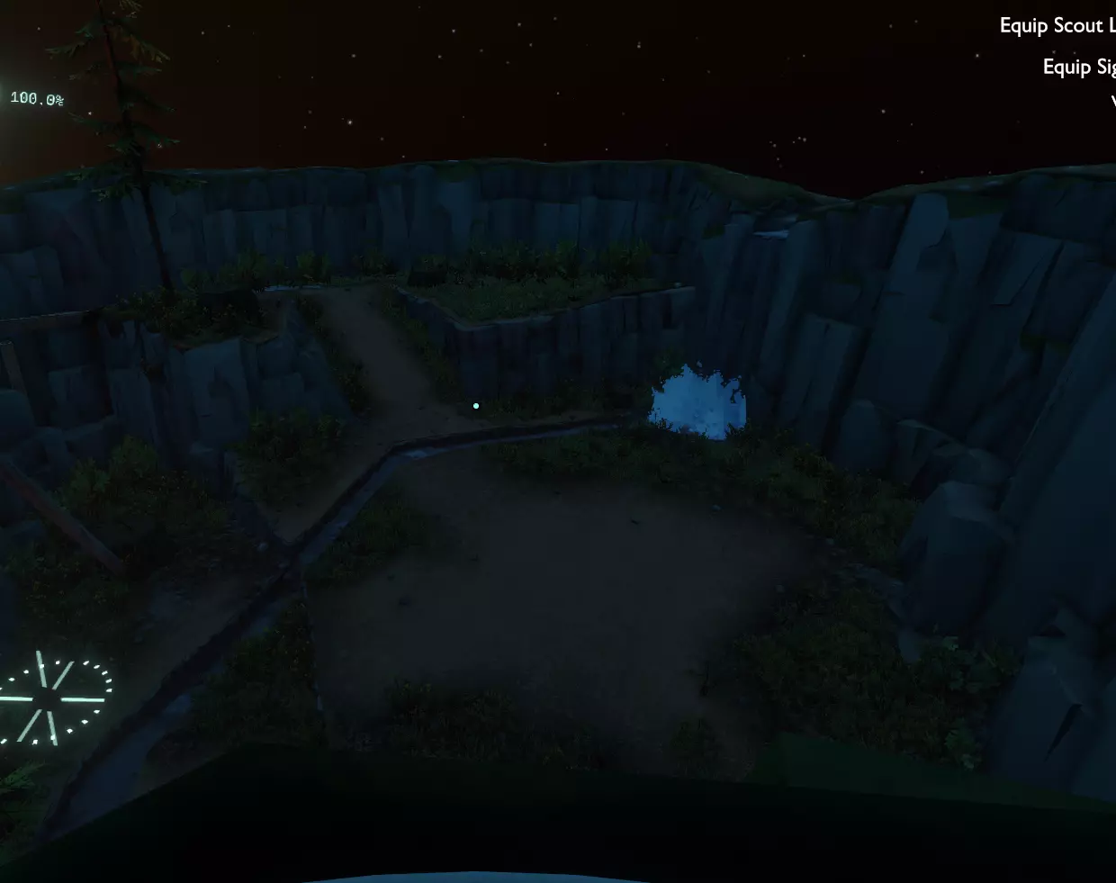 如果你降落在那个看起来有瀑布的较大区域附近或内部,还会看到一座塔状建筑。在塔顶,你会发现一张纸条,上面写着附近有一个奇怪的信号,可能与【量子之月】有关。 装备信号镜并大致朝着河流流动的方向对准,你就能捕捉到一个未知信号。 回到地面并沿着河流前进。这可能是进入这个陨石坑最简单的方法。 陨石坑内有几个路标,上面有一首出奇准确的诗,诗中提到这个陨石坑永远一片漆黑,事实也确实如此。 但你可能会看到一块竖立的、略带黑色且闪闪发光的岩石,也可能看不到。