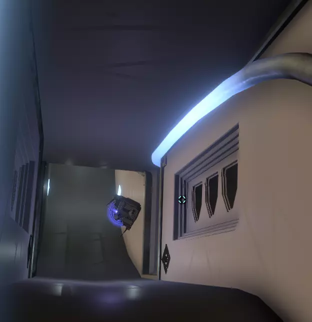 现在继续沿着这条路走,直到你找到一座可以进入的建筑。那里有一面向上的重力墙。跳到墙上继续前行,直到你看到一个观察窗和两道重力光束,一道向下,一道向上。